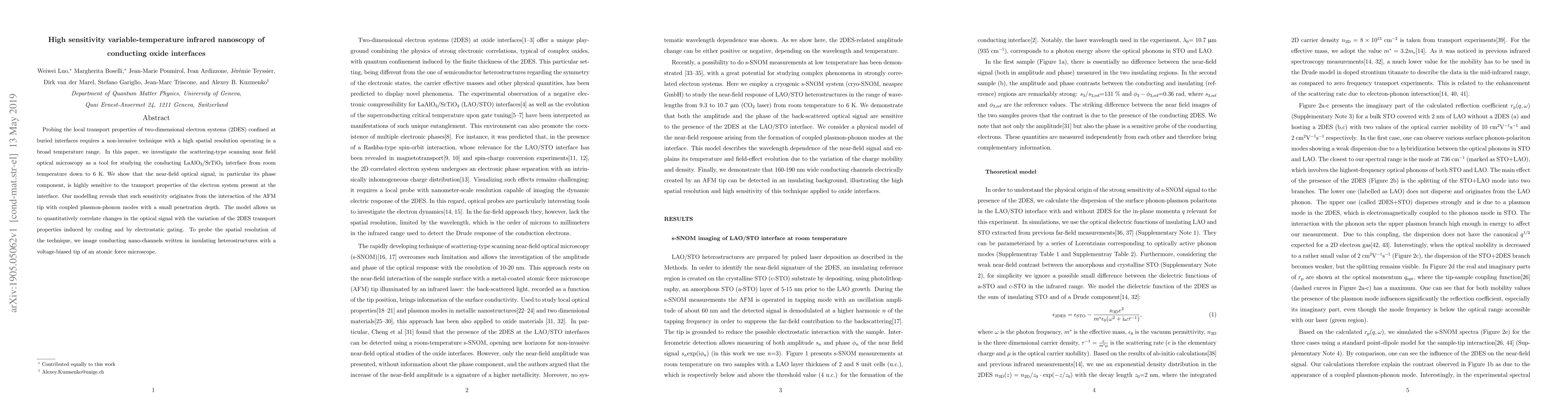 Probing the local transport properties of two-dimensional electron systems (2DES) confined at buried interfaces requires a non-invasive technique with a high spatial resolution operating in a broad temperature range. In this paper, we investigate the scattering-type scanning near field optical microscopy as a tool for studying the conducting LaAlO3/SrTiO3 interface from room temperature down to 6 K. We show that the near-field optical signal, in particular its phase component, is highly sensitive to the transport properties of the electron system present at the interface. Our modelling reveals that such sensitivity originates from the interaction of the AFM tip with coupled plasmon-phonon modes with a small penetration depth. The model allows us to quantitatively correlate changes in the optical signal with the variation of the 2DES transport properties induced by cooling and by electrostatic gating. To probe the spatial resolution of the technique, we image conducting nano-channels written in insulating heterostructures with a voltage-biased tip of an atomic force microscope.