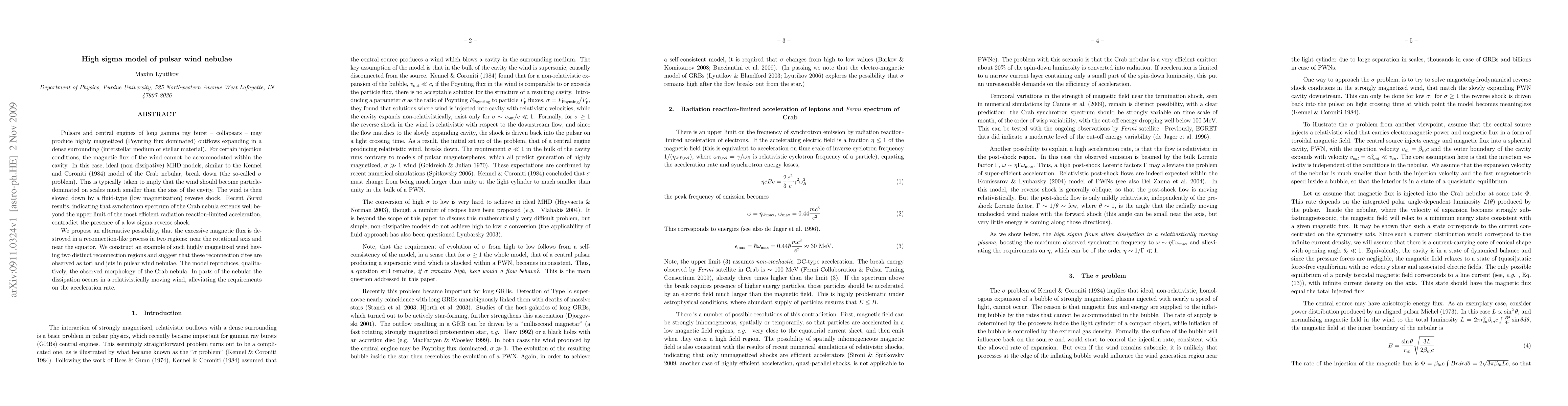 This paper proposes a high sigma model for pulsar wind nebulae, suggesting that excessive magnetic flux is destroyed via reconnection near the pulsar's rotational axis and equator, which explains the observed morphology of the Crab nebula and reconciles recent Fermi observations. This model alleviates the need for a low sigma reverse shock.