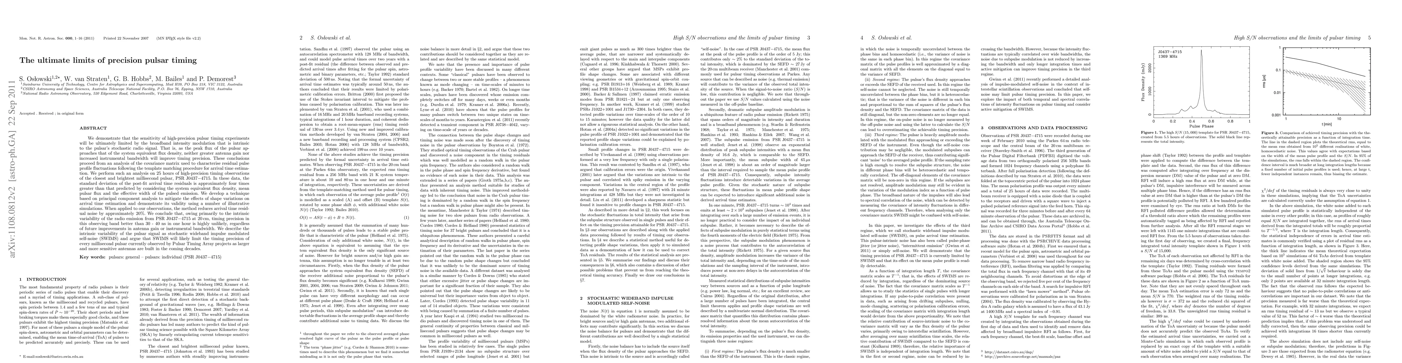 We demonstrate that the sensitivity of high-precision pulsar timing experiments will be ultimately limited by the broadband intensity modulation that is intrinsic to the pulsar's stochastic radio signal. That is, as the peak flux of the pulsar approaches that of the system equivalent flux density, neither greater antenna gain nor increased instrumental bandwidth will improve timing precision. These conclusions proceed from an analysis of the covariance matrix used to characterise residual pulse profile fluctuations following the template matching procedure for arrival time estimation. We perform such an analysis on 25 hours of high-precision timing observations of the closest and brightest millisecond pulsar, PSR J0437-4715. In these data, the standard deviation of the post-fit arrival time residuals is approximately four times greater than that predicted by considering the system equivalent flux density, mean pulsar flux and the effective width of the pulsed emission. We develop a technique based on principal component analysis to mitigate the effects of shape variations on arrival time estimation and demonstrate its validity using a number of illustrative simulations. When applied to our observations, the method reduces arrival time residual noise by approximately 20%. We conclude that, owing primarily to the intrinsic variability of the radio emission from PSR J0437-4715 at 20 cm, timing precision in this observing band better than 30 - 40 ns in one hour is highly unlikely, regardless of future improvements in antenna gain or instrumental bandwidth. We describe the intrinsic variability of the pulsar signal as stochastic wideband impulse modulated self-noise (SWIMS) and argue that SWIMS will likely limit the timing precision of every millisecond pulsar currently observed by Pulsar Timing Array projects as larger and more sensitive antennae are built in the coming decades.