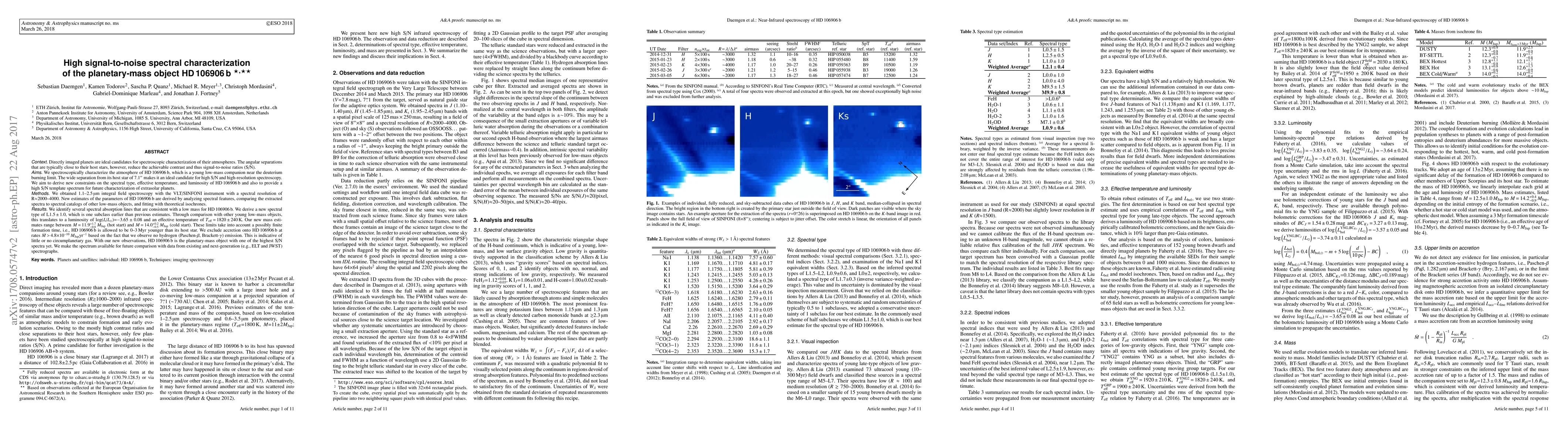 We spectroscopically characterize the atmosphere of HD 106906b, a young low-mass companion near the deuterium burning limit. The wide separation from its host star of 7.1" makes it an ideal candidate for high S/N and high-resolution spectroscopy. We aim to derive new constraints on the spectral type, effective temperature, and luminosity of HD106906b and also to provide a high S/N template spectrum for future characterization of extrasolar planets. We obtained 1.1-2.5 $\mu$m integral field spectroscopy with the VLT/SINFONI instrument with a spectral resolution of R~2000-4000. New estimates of the parameters of HD 106906b are derived by analyzing spectral features, comparing the extracted spectra to spectral catalogs of other low-mass objects, and fitting with theoretical isochrones. We identify several spectral absorption lines that are consistent with a low mass for HD 106906b. We derive a new spectral type of L1.5$\pm$1.0, one subclass earlier than previous estimates. Through comparison with other young low-mass objects, this translates to a luminosity of log($L/L_\odot$)=$-3.65\pm0.08$ and an effective temperature of Teff=$1820\pm240$ K. Our new mass estimates range between $M=11.9^{+1.7}_{-0.8} M_{\rm Jup}$ (hot start) and $M=14.0^{+0.2}_{-0.5} M_{\rm Jup}$ (cold start). These limits take into account a possibly finite formation time, i.e., HD 106906b is allowed to be 0--3 Myr younger than its host star. We exclude accretion onto HD 106906b at rates $\dot{M}>4.8\times10^{-10} M_{\rm Jup}$yr$^{-1}$ based on the fact that we observe no hydrogen (Paschen-$\beta$, Brackett-$\gamma$) emission. This is indicative of little or no circumplanetary gas. With our new observations, HD 106906b is the planetary-mass object with one of the highest S/N spectra yet. We make the spectrum available for future comparison with data from existing and next-generation (e.g., ELT and JWST) spectrographs.