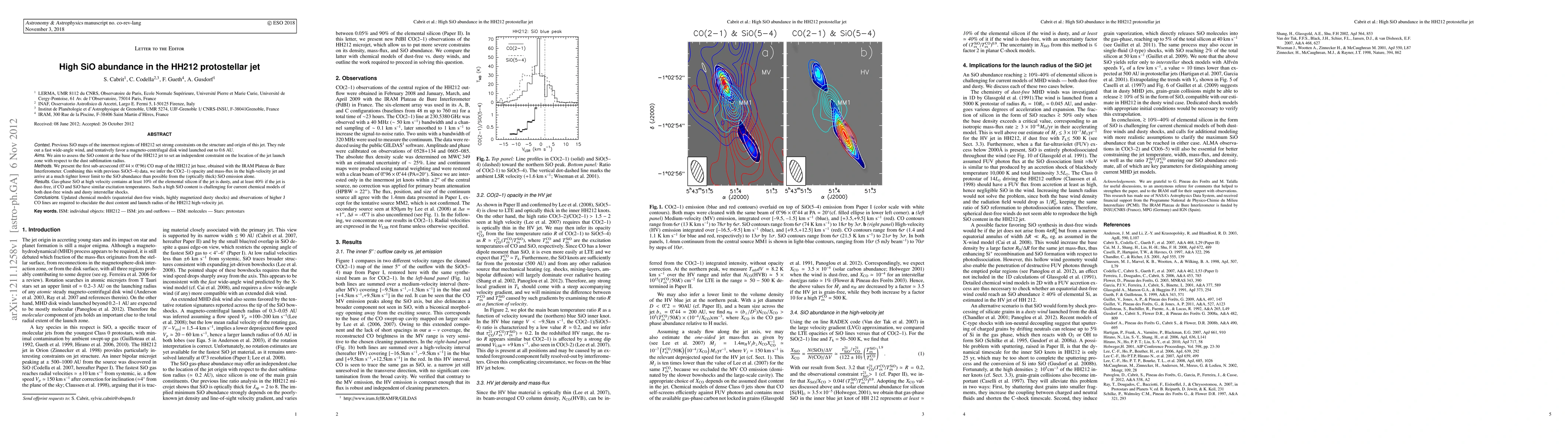 Previous SiO maps of the innermost regions of HH212 set strong constraints on the structure and origin of this jet. They rule out a fast wide-angle wind, and tentatively favor a magneto-centrifugal disk wind launched out to 0.6 AU. We aim to assess the SiO content at the base of the HH212 jet to set an independent constraint on the location of the jet launch zone with respect to the dust sublimation radius. We present the first sub-arcsecond (0"44x0"96) CO map of the HH212 jet base, obtained with the IRAM Plateau de Bure Interferometer. Combining this with previous SiO(5-4) data, we infer the CO(2-1) opacity and mass-flux in the high-velocity jet and arrive at a much tighter lower limit to the SiO abundance than possible from the (optically thick) SiO emission alone. Gas-phase SiO at high velocity contains at least 10% of the elemental silicon if the jet is dusty, and at least 40% if the jet is dust-free, if CO and SiO have similar excitation temperatures. Such a high SiO content is challenging for current chemical models of both dust-free winds and dusty interstellar shocks. Updated chemical models (equatorial dust-free winds, highly magnetized dusty shocks) and observations of higher J CO lines are required to elucidate the dust content and launch radius of the HH212 high-velocity jet.