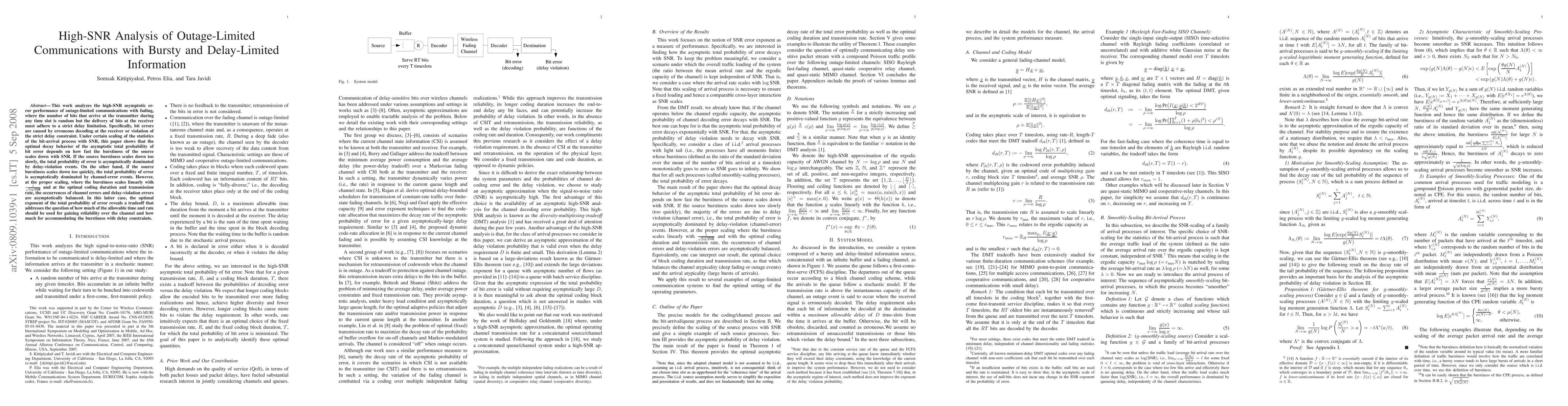 This work analyzes the high-SNR asymptotic error performance of outage-limited communications with fading, where the number of bits that arrive at the transmitter during any time slot is random but the delivery of bits at the receiver must adhere to a strict delay limitation. Specifically, bit errors are caused by erroneous decoding at the receiver or violation of the strict delay constraint. Under certain scaling of the statistics of the bit-arrival process with SNR, this paper shows that the optimal decay behavior of the asymptotic total probability of bit error depends on how fast the burstiness of the source scales down with SNR. If the source burstiness scales down too slowly, the total probability of error is asymptotically dominated by delay-violation events. On the other hand, if the source burstiness scales down too quickly, the total probability of error is asymptotically dominated by channel-error events. However, at the proper scaling, where the burstiness scales linearly with 1/sqrt(log SNR) and at the optimal coding duration and transmission rate, the occurrences of channel errors and delay-violation errors are asymptotically balanced. In this latter case, the optimal exponent of the total probability of error reveals a tradeoff that addresses the question of how much of the allowable time and rate should be used for gaining reliability over the channel and how much for accommodating the burstiness with delay constraints.