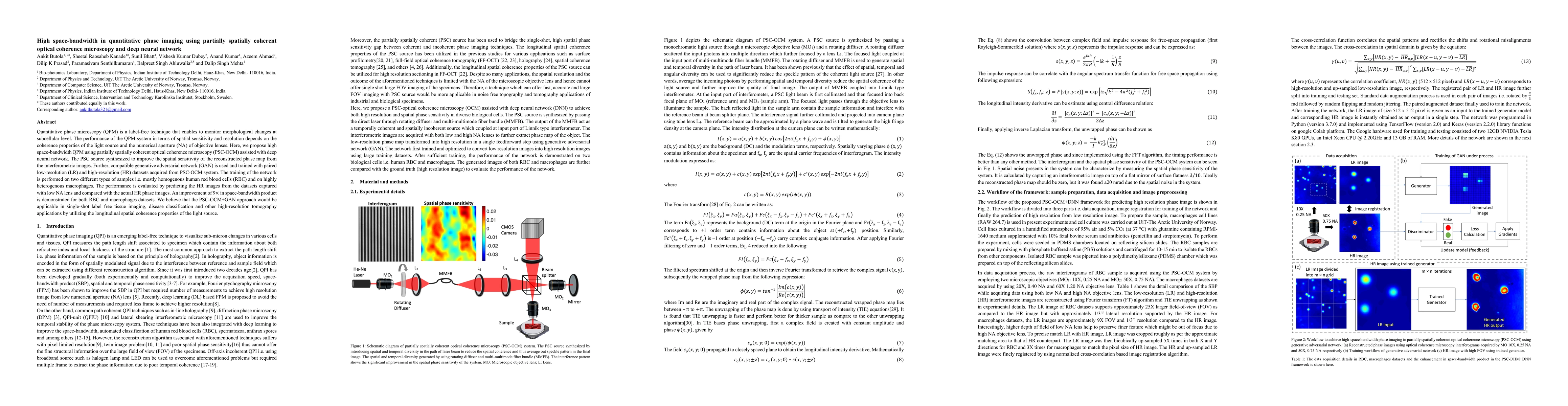Quantitative phase microscopy (QPM) is a label-free technique that enables to monitor morphological changes at subcellular level. The performance of the QPM system in terms of spatial sensitivity and resolution depends on the coherence properties of the light source and the numerical aperture (NA) of objective lenses. Here, we propose high space-bandwidth QPM using partially spatially coherent optical coherence microscopy (PSC-OCM) assisted with deep neural network. The PSC source synthesized to improve the spatial sensitivity of the reconstructed phase map from the interferometric images. Further, compatible generative adversarial network (GAN) is used and trained with paired low-resolution (LR) and high-resolution (HR) datasets acquired from PSC-OCM system. The training of the network is performed on two different types of samples i.e. mostly homogenous human red blood cells (RBC) and on highly heterogenous macrophages. The performance is evaluated by predicting the HR images from the datasets captured with low NA lens and compared with the actual HR phase images. An improvement of 9 times in space-bandwidth product is demonstrated for both RBC and macrophages datasets. We believe that the PSC-OCM+GAN approach would be applicable in single-shot label free tissue imaging, disease classification and other high-resolution tomography applications by utilizing the longitudinal spatial coherence properties of the light source.
