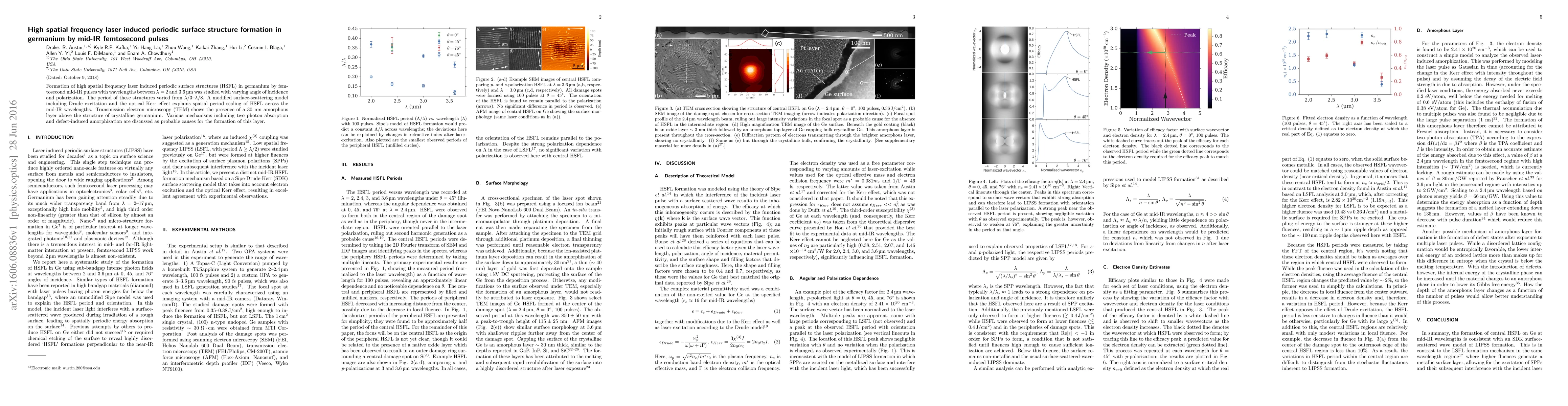 This study investigates the formation of high spatial frequency laser induced periodic surface structures (HSFL) in germanium using femtosecond mid-IR pulses, finding that the period scales with wavelength and is influenced by angle of incidence and polarization. Transmission electron microscopy reveals a 30 nm amorphous layer above the crystalline germanium, with mechanisms like two-photon absorption and defect-induced amorphization proposed for its formation.