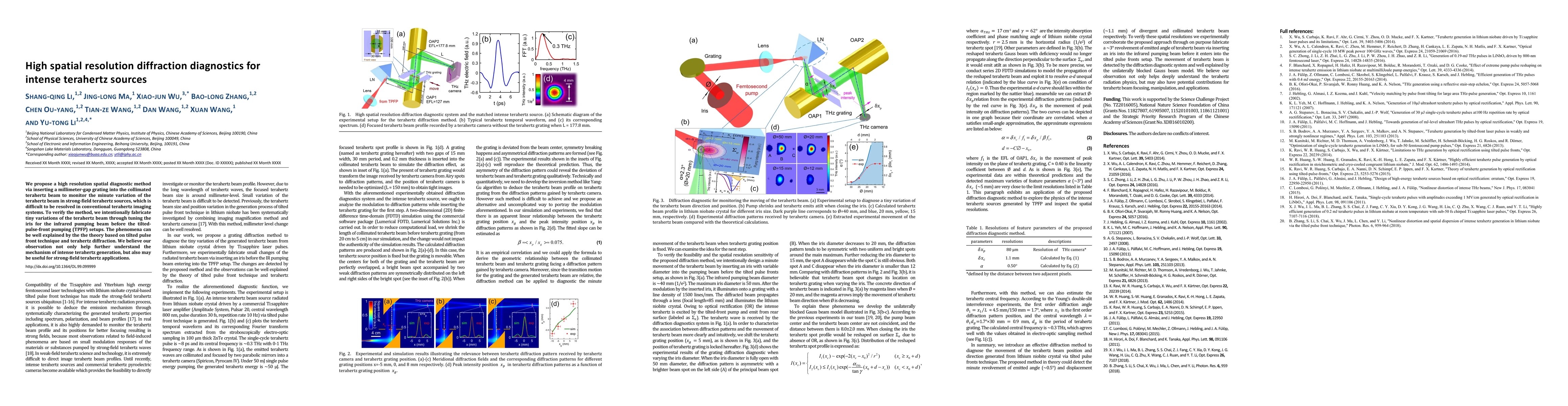We propose a high resolution spatial diagnostic method via inserting a millimeter-gap grating into the collimated terahertz beam to monitor the minute variation of the terahertz beam in strong-field terahertz sources, which is difficult to be resolved in conventional terahertz imaging systems. To verify the method, we intentionally fabricate tiny variations of the terahertz beam through tuning the iris for the infrared pumping beam before the tilted pulse-front pumping (TPFP) setups. The phenomena can be well explained by the the theory based on tilted pulse front technique and terahertz diffraction. We believe our observation not only help further understand the mechanism of intense terahertz generation, but also may be useful for strong-field terahertz applications.