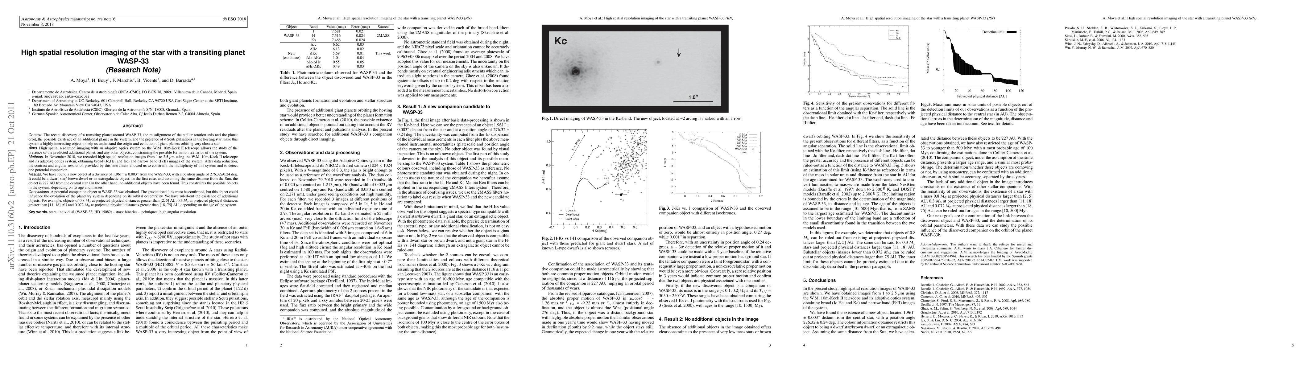 The recent discovery of a transiting planet around WASP-33, the misalignment of the stellar rotation axis and the planet orbit, the possible existence of an additional planet in the system, and the presence of $\delta$ Scuti pulsations in the hosting star make this system a highly interesting object to help us understand the origin and evolution of giant planets orbiting very close a star. High spatial resolution imaging allows the study of the presence of the predicted additional planet, and any other objects, constraining the possible formation scenarios of the system. In November 2010, we recorded high spatial resolution images from 1 to 2.5 $\mu$m using the W.M. 10m-Keck II telescope and its adaptive optics system, obtaining broad (Jc,Hc, and Kc) and narrow band (FeII) images of the system. After data reduction, the contrast and angular resolution provided by this instrument allowed us to constraint the multiplicity of this system and to detect one potential companion. We have found a new object at a distance of 1.961$"$ $\pm$ 0.003$"$ from the WASP-33, with a position angle of 276.32$\pm$0.24 deg. It could be a dwarf star/ brown dwarf or an extragalactic object. In the first case, and assuming the same distance from the Sun, the object is 227 AU from the central star. On the other hand, no additional objects have been found. This constraints the possible objects in the system, depending on its age and masses. A potential companion object to WASP-33 was obtained. The gravitational link must be confirmed, but this object could influence the evolution of the planetary system depending on its orbital eccentricity. We have ruled-out the existence of additional objects, depending on the age of the system.