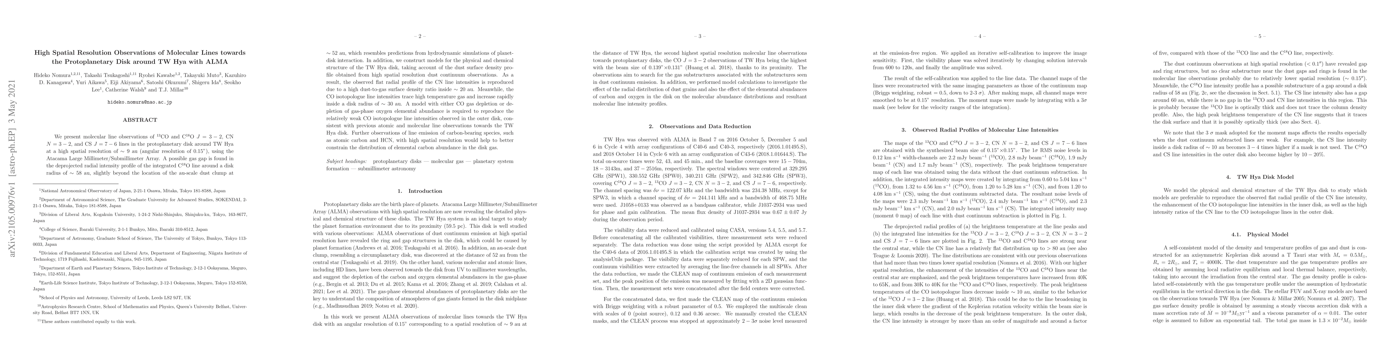 This study uses ALMA to observe molecular lines in the TW Hya protoplanetary disk, revealing a possible gas gap beyond a dust clump, consistent with planet-disk interaction models. The findings suggest CO gas depletion or reduced oxygen abundance in the outer disk, with further high-resolution observations needed to better understand carbon distribution.