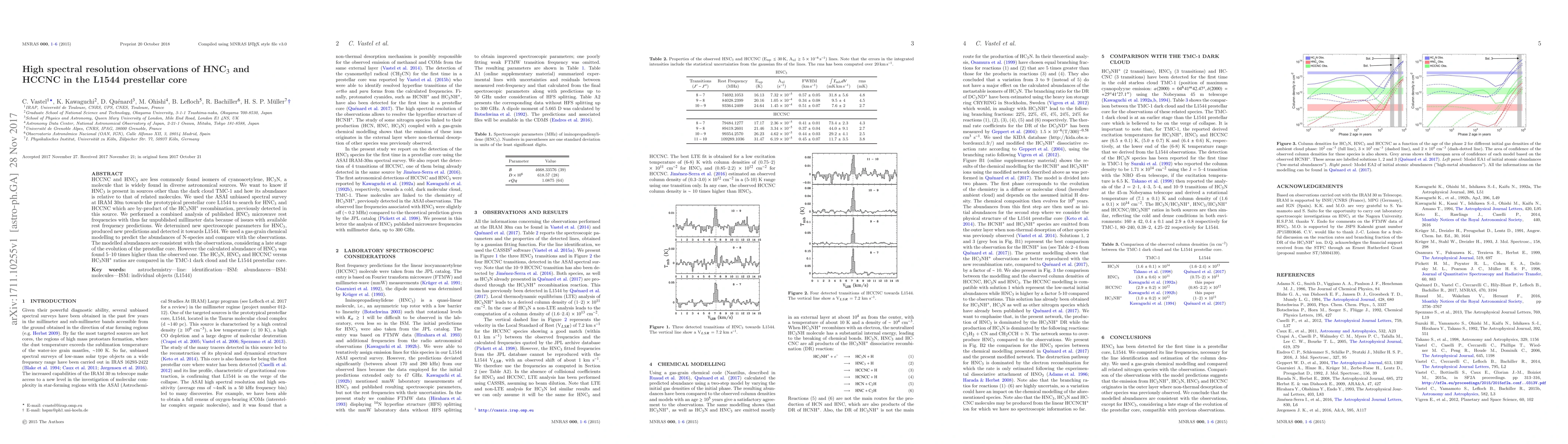 This study investigates the presence and abundance of HNC3 and HCCNC in the L1544 prestellar core using high spectral resolution observations. The findings suggest HNC3 is present in L1544, but its modeled abundance is 5-10 times higher than observed, indicating discrepancies in chemical evolution models.