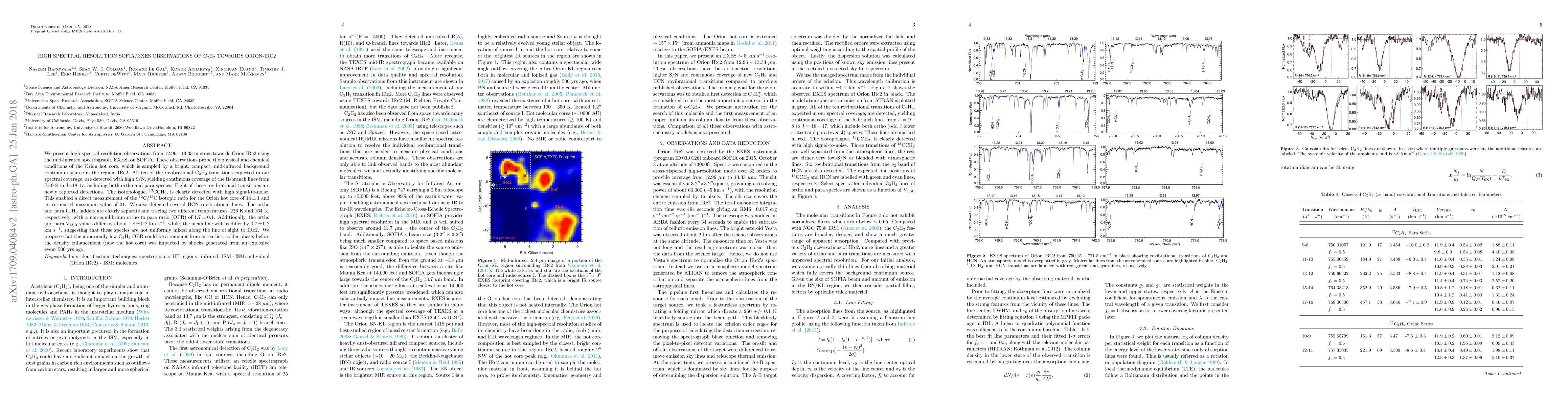 We present high-spectral resolution observations from 12.96 - 13.33 microns towards Orion IRc2 using the mid-infrared spectrograph, EXES, on SOFIA. These observations probe the physical and chemical conditions of the Orion hot core, which is sampled by a bright, compact, mid-infrared background continuum source in the region, IRc2. All ten of the rovibrational C2H2 transitions expected in our spectral coverage, are detected with high S/N, yielding continuous coverage of the R-branch lines from J=9-8 to J=18-17, including both ortho and para species. Eight of these rovibrational transitions are newly reported detections. The isotopologue, 13CCH2, is clearly detected with high signal-to-noise. This enabled a direct measurement of the 12C/13C isotopic ratio for the Orion hot core of 14 +/- 1 and an estimated maximum value of 21. We also detected several HCN rovibrational lines. The ortho and para C2H2 ladders are clearly separate and tracing two different temperatures, 226 K and 164 K, respectively, with a non-equilibrium ortho to para ratio (OPR) of 1.7 +\- 0.1. Additionally, the ortho and para V_LSR values differ by about 1.8 +/- 0.2 km/s, while, the mean line widths differ by 0.7 +/- 0.2 km/s, suggesting that these species are not uniformly mixed along the line of sight to IRc2. We propose that the abnormally low C2H2 OPR could be a remnant from an earlier, colder phase, before the density enhancement (now the hot core) was impacted by shocks generated from an explosive event 500 yrs ago.