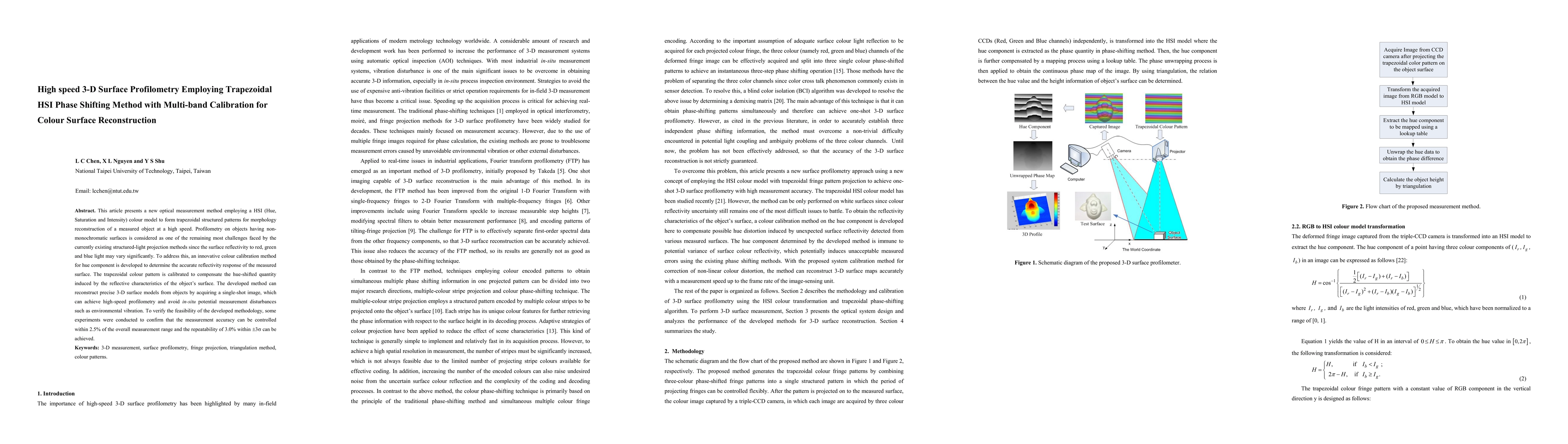 This article presents a new optical measurement method employing a HSI (Hue, Saturation and Intensity) colour model to form trapezoidal structured patterns for morphology reconstruction of a measured object at a high speed. Profilometry on objects having non-monochromatic surfaces is considered as one of the remaining most challenges faced by the currently existing structured-light projection methods since the surface reflectivity to red, green and blue light may vary significantly. To address this, an innovative colour calibration method for hue component is developed to determine the accurate reflectivity response of the measured surface. The trapezoidal colour pattern is calibrated to compensate the hue-shifted quantity induced by the reflective characteristics of the object's surface. The developed method can reconstruct precise 3-D surface models from objects by acquiring a single-shot image, which can achieve high-speed profilometry and avoid in-situ potential measurement disturbances such as environmental vibration. To verify the feasibility of the developed methodology, some experiments were conducted to confirm that the measurement accuracy can be controlled within 2.5% of the overall measurement range and the repeatability of 3.0% within +/- 3*sigma can be achieved.