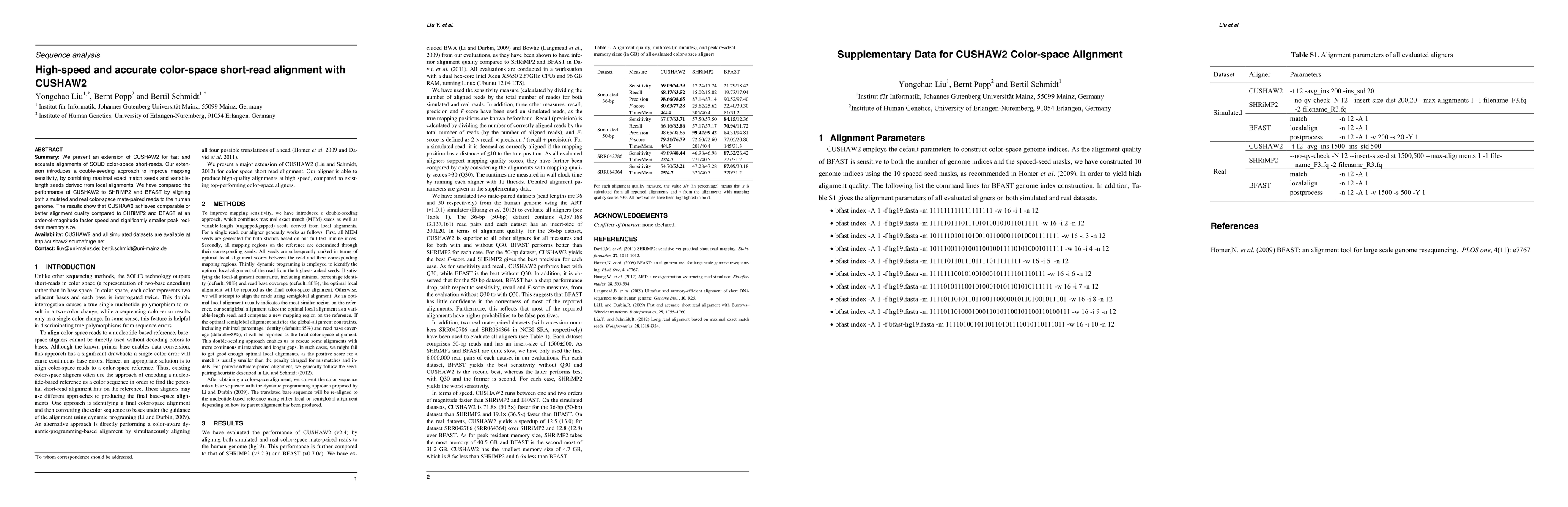 Summary: We present an extension of CUSHAW2 for fast and accurate alignments of SOLiD color-space short-reads. Our extension introduces a double-seeding approach to improve mapping sensitivity, by combining maximal exact match seeds and variable-length seeds derived from local alignments. We have compared the performance of CUSHAW2 to SHRiMP2 and BFAST by aligning both simulated and real color-space mate-paired reads to the human genome. The results show that CUSHAW2 achieves comparable or better alignment quality compared to SHRiMP2 and BFAST at an order-of-magnitude faster speed and significantly smaller peak resident memory size. Availability: CUSHAW2 and all simulated datasets are available at http://cushaw2.sourceforge.net. Contact: [email protected]; [email protected]
