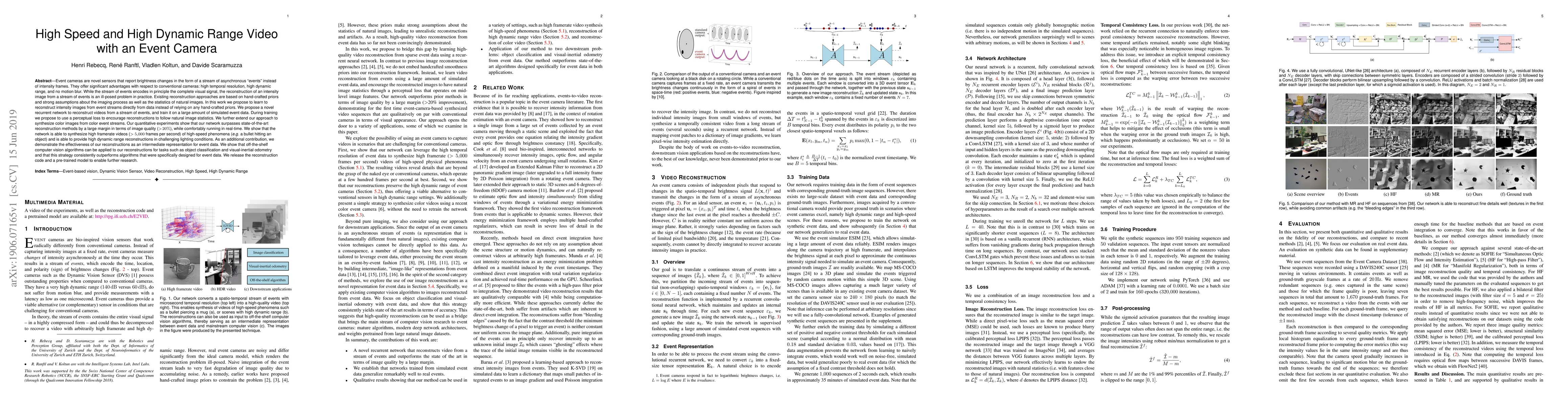 This paper proposes a novel recurrent network to reconstruct high-speed, high dynamic range intensity and color videos from event streams, trained directly from data without hand-crafted priors. The network achieves superior reconstruction quality and real-time performance, enabling applications like object classification and visual-inertial odometry.