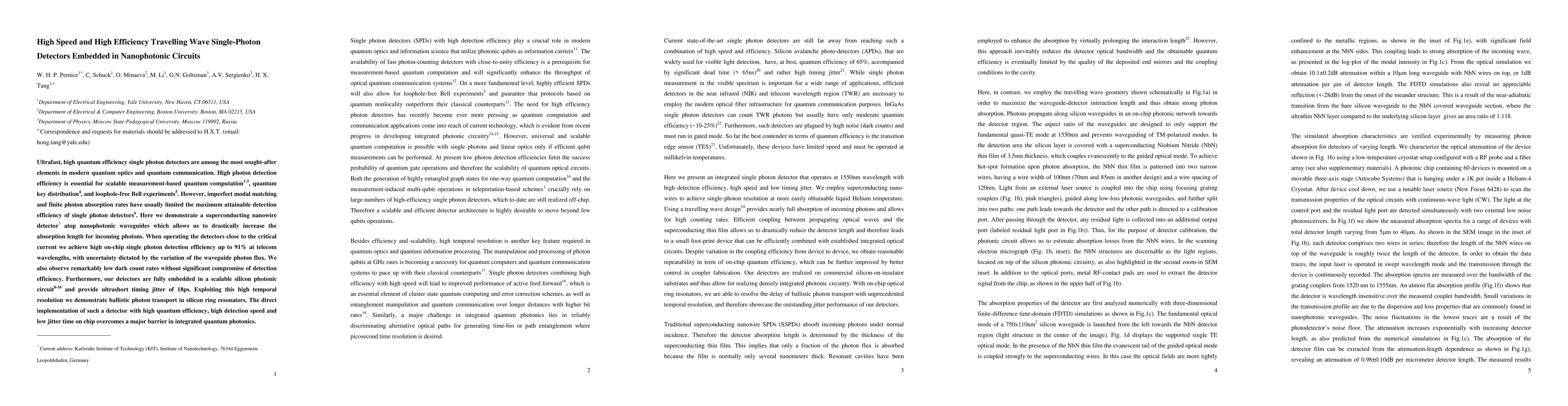 This paper presents a superconducting nanowire single-photon detector embedded in nanophotonic circuits, achieving high detection efficiency of up to 91% at telecom wavelengths with low dark count rates and ultrashort timing jitter of 18ps. This advancement significantly enhances integrated quantum photonics for quantum communication and computation.