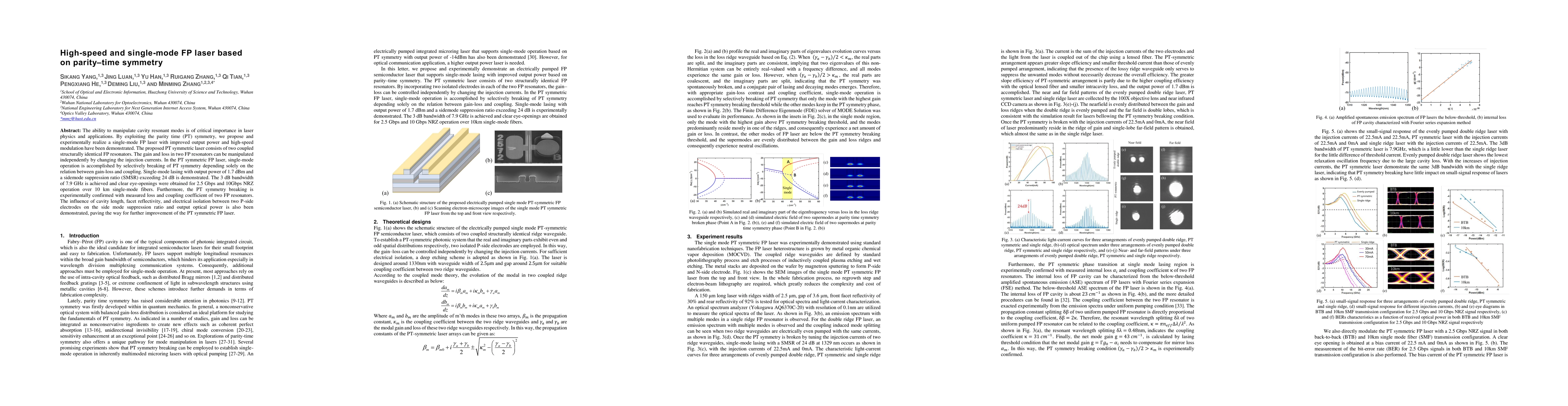 This paper proposes and demonstrates a high-speed, single-mode distributed feedback (DFB) laser based on parity-time symmetry, achieving improved output power and high modulation speed. The PT symmetric FP laser employs two coupled resonators with independently adjustable gain and loss, enabling single-mode operation through selective symmetry breaking.