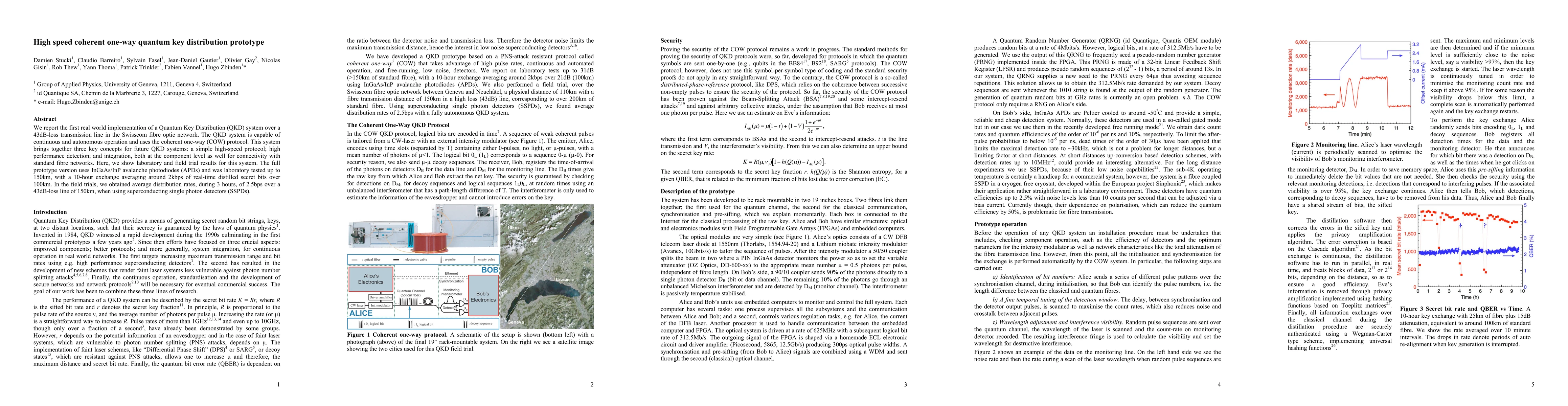 This paper presents a prototype for high-speed coherent one-way quantum key distribution (QKD) over a 43dB-loss fiber optic line in the Swisscom network, achieving real-time secret bit distribution rates of 2.5bps over 150km. The system integrates high-speed protocol, advanced detection, and seamless connectivity with standard fiber networks.