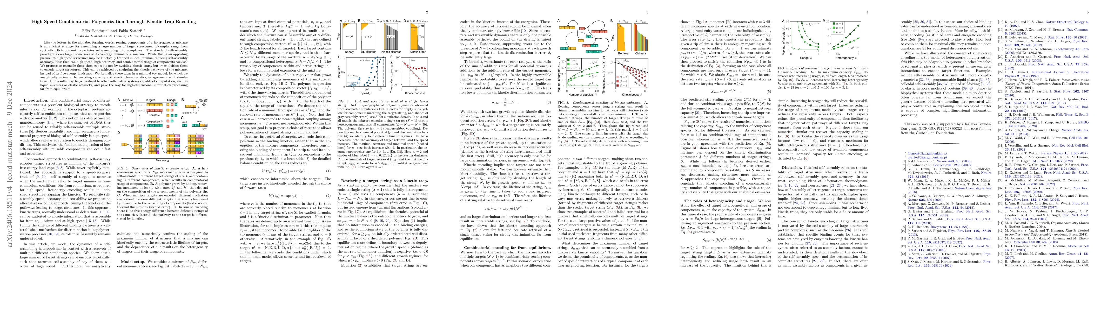 This paper proposes a method for high-speed combinatorial self-assembly by leveraging kinetic traps to encode target structures, instead of relying on free-energy minima. This approach enhances accuracy and efficiency, potentially extending to various soft-matter systems for advanced information processing.