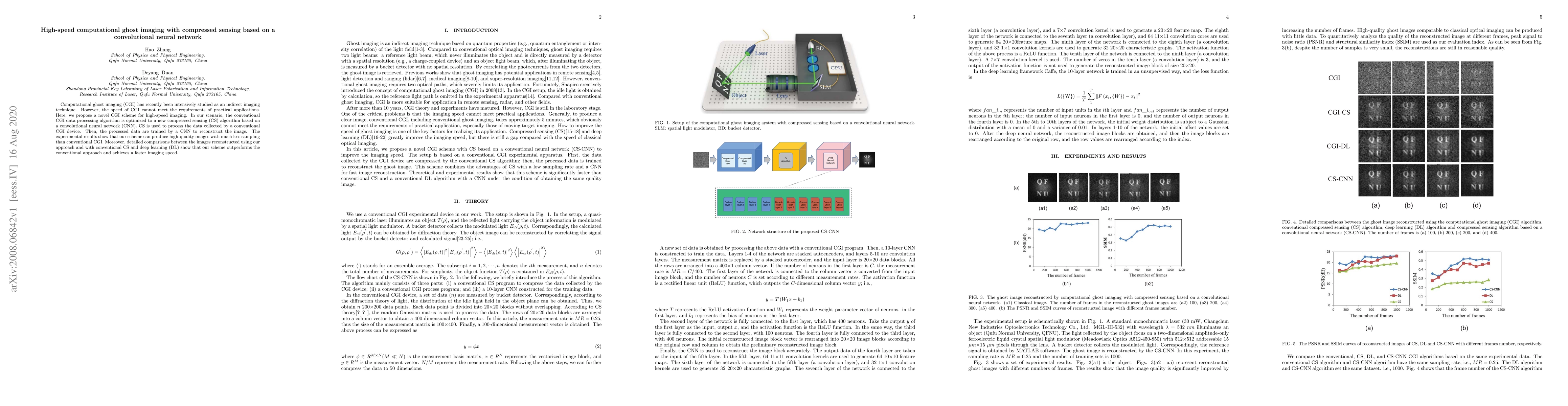 A novel method for high-speed computational ghost imaging (CGI) is proposed, combining the advantages of Compressive Sensing (CS) and Convolutional Neural Networks (CNN).