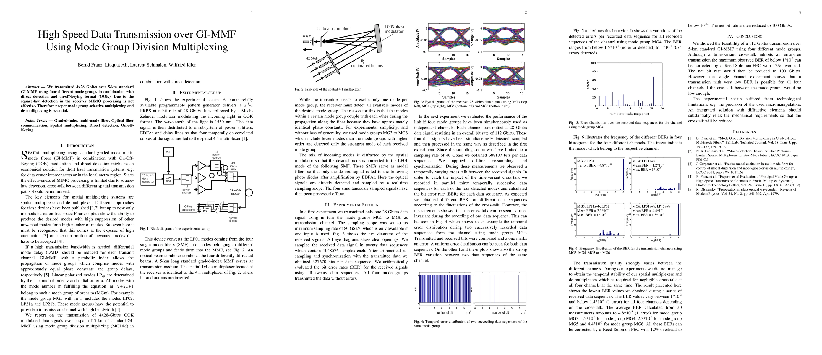 We transmitted 4x28 Gbit/s over 5-km standard GI-MMF using four different mode groups in combination with direct detection and on-off-keying format (OOK). Due to the square-law detection in the receiver MIMO processing is not effective. Therefore proper mode group selective multiplexing and de-multiplexing is essential.