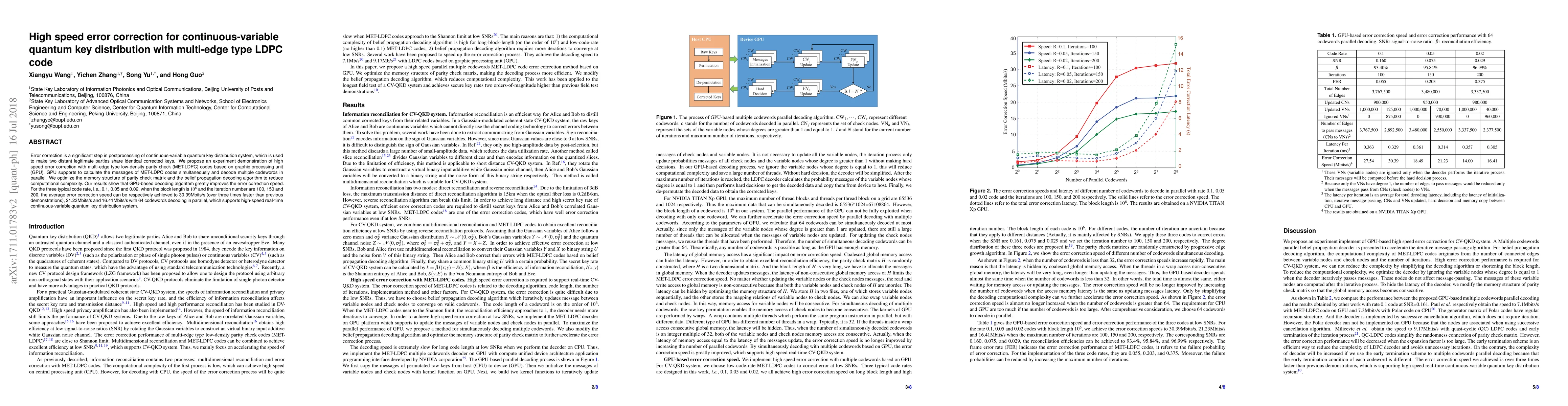 This paper proposes an efficient high-speed error correction method for continuous-variable quantum key distribution using multi-edge type LDPC codes and GPU-based decoding. The experiment demonstrates significant speed improvements over previous methods, achieving average error correction speeds of up to 30.39 Mbits/s for typical code rates.
