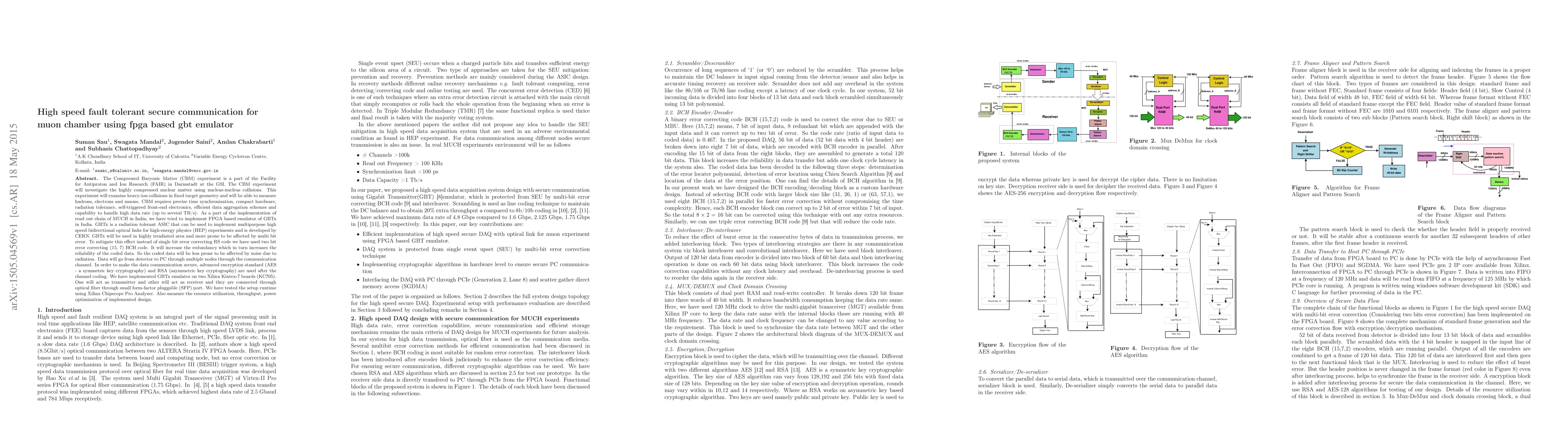 The Compressed Baryonic Matter (CBM) experiment is a part of the Facility for Antiproton and Ion Research (FAIR) in Darmstadt at the GSI. The CBM experiment will investigate the highly compressed nuclear matter using nucleus-nucleus collisions. This experiment will examine heavy-ion collisions in fixed target geometry and will be able to measure hadrons, electrons and muons. CBM requires precise time synchronization, compact hardware, radiation tolerance, self-triggered front-end electronics, efficient data aggregation schemes and capability to handle high data rate (up to several TB/s). As a part of the implementation of read out chain of MUCH in India, we have tried to implement FPGA based emulator of GBTx in India. GBTx is a radiation tolerant ASIC that can be used to implement multipurpose high speed bidirectional optical links for high-energy physics (HEP) experiments and is developed by CERN. GBTx will be used in highly irradiated area and more prone to be affected by multi bit error. To mitigate this effect instead of single bit error correcting RS code we have used two bit error correcting (15, 7) BCH code. It will increase the redundancy which in turn increases the reliability of the coded data. So the coded data will be less prone to be affected by noise due to radiation. Data will go from detector to PC through multiple nodes through the communication channel. In order to make the data communication secure, advanced encryption standard (AES - a symmetric key cryptography) and RSA (asymmetric key cryptography) are used after the channel coding.