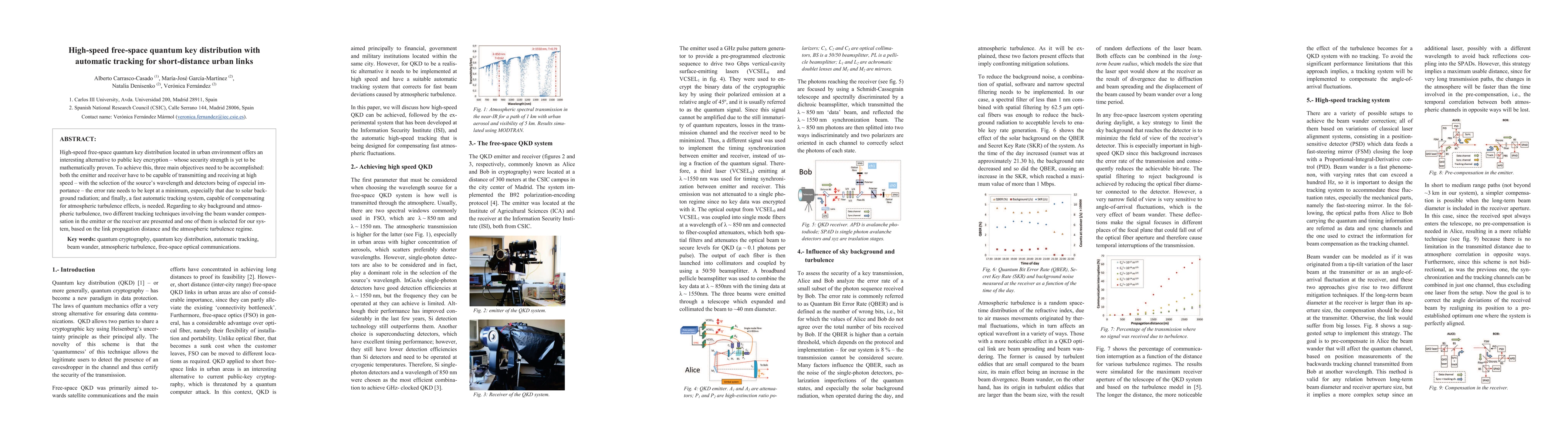 High-speed free-space quantum key distribution located in urban environment offers an interesting alternative to public key encryption - whose security strength is yet to be mathematically proven. To achieve this, three main objectives need to be accomplished: both the emitter and receiver have to be capable of transmitting and receiving at high speed - with the selection of the source's wavelength and detectors being of especial importance - the error rate needs to be kept at a minimum, especially that due to solar background radiation; and finally, a fast automatic tracking system, capable of compensating for atmospheric turbulence effects, is needed. Regarding to sky background and atmospheric turbulence, two different tracking techniques involving the beam wander compensation in the emitter or the receiver are presented and one of them is selected for our system, based on the link propagation distance and the atmospheric turbulence regime.