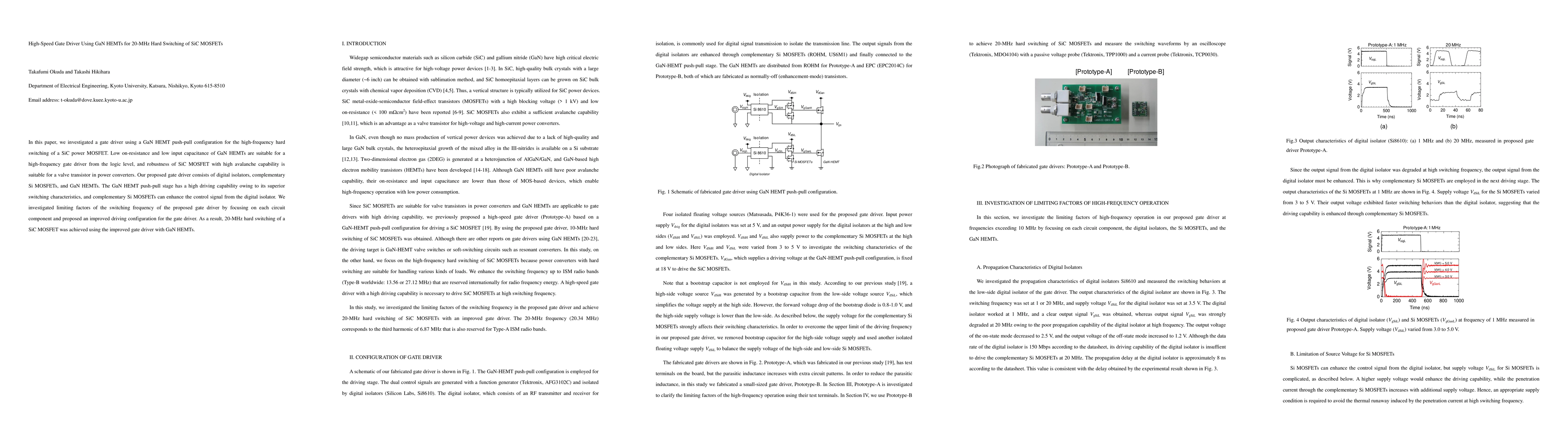 This paper proposes a high-speed gate driver using GaN HEMTs for 20-MHz hard switching of SiC MOSFETs, leveraging the low on-resistance and low input capacitance of GaN HEMTs and the robustness of SiC MOSFETs. The improved gate driver configuration achieved the desired high-frequency switching performance.