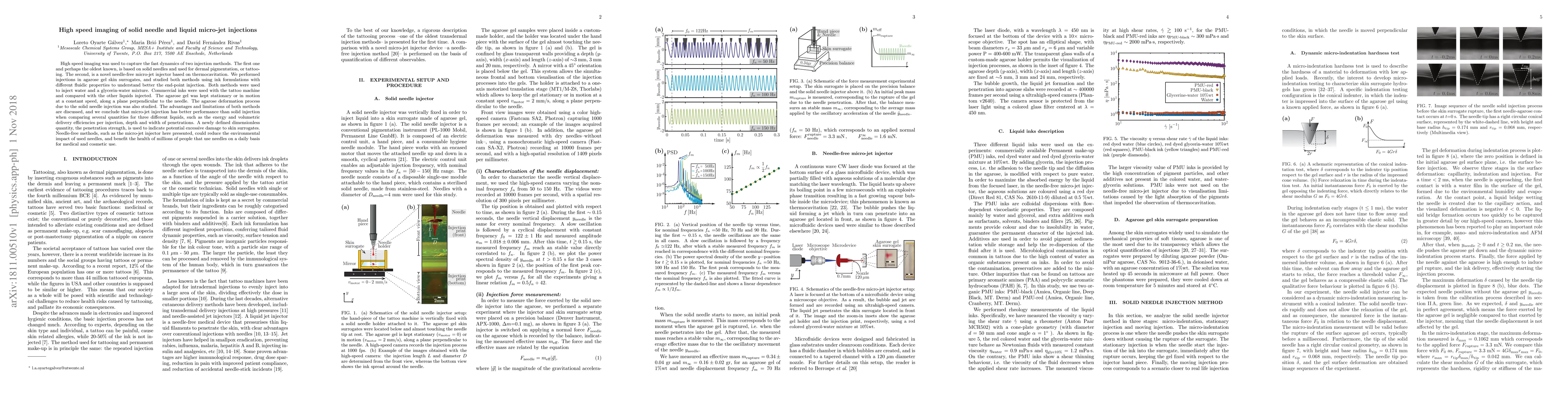 High speed imaging was used to capture the fast dynamics of two injection methods. The first one and perhaps the oldest known, is based on solid needles and used for dermal pigmentation, or tattooing. The second, is a novel needle-free micro-jet injector based on thermocavitation. We performed injections in agarose gel skin surrogates, and studied both methods using ink formulations with different fluidic properties to understand better the end-point injection. Both methods were used to inject water and a glycerin-water mixture. Commercial inks were used with the tattoo machine and compared with the other liquids injected. The agarose gel was kept stationary or in motion at a constant speed, along a plane perpendicular to the needle. The agarose deformation process due to the solid needle injection was also studied. The advantages and limitations of both methods are discussed, and we conclude that micro-jet injection has better performance than solid injection when comparing several quantities for three different liquids, such as the energy and volumetric delivery efficiencies per injection, depth and width of penetrations. A newly defined dimensionless quantity, the penetration strength, is used to indicate potential excessive damage to skin surrogates. Needle-free methods, such as the micro-jet injector here presented, could reduce the environmental impact of used needles, and benefit the health of millions of people that use needles on a daily basis for medical and cosmetic use.