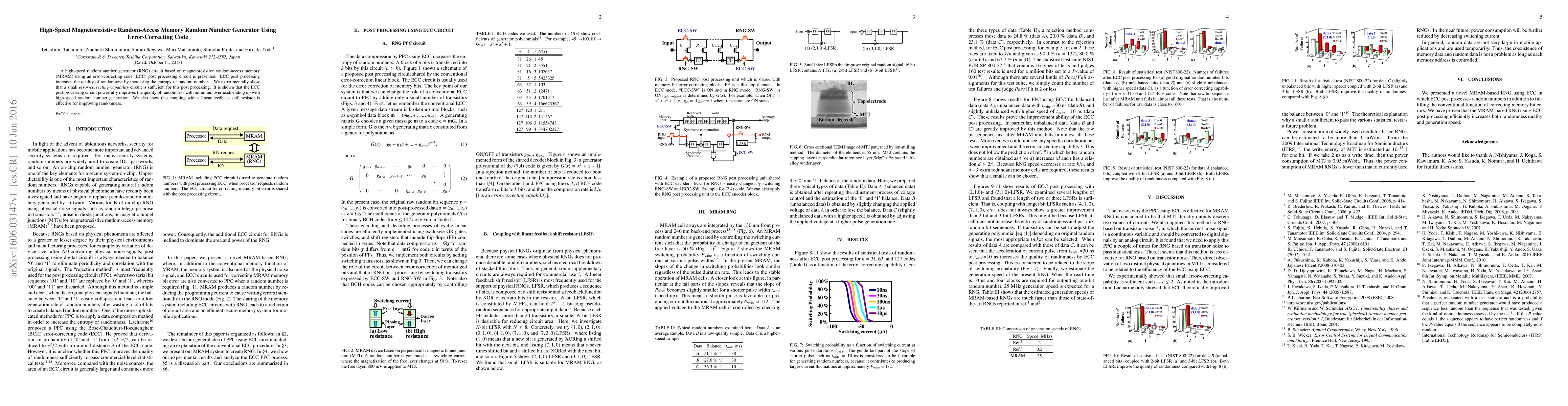 A high-speed random number generator (RNG) circuit based on magnetoresistive random-access memory (MRAM) using an error-correcting code (ECC) post processing circuit is presented. ECC post processing increases the quality of randomness by increasing the entropy of random number. { We experimentally show that a small error-correcting capability circuit is sufficient for this post processing. It is shown that the ECC post processing circuit powerfully improves the quality of randomness with minimum overhead, ending up with high-speed random number generation. We also show that coupling with a linear feedback shift resistor is effective for improving randomness