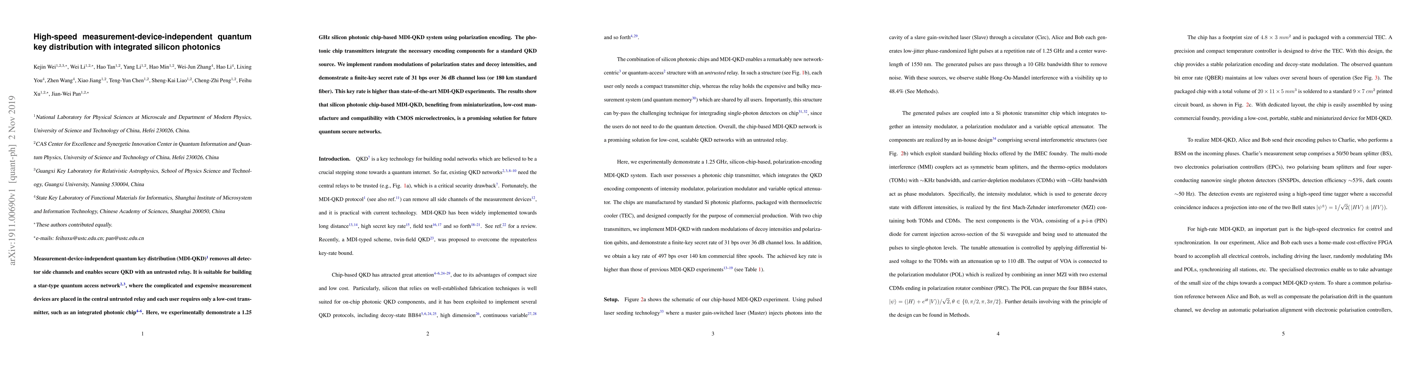 This research experimentally demonstrates a high-speed, low-cost measurement-device-independent quantum key distribution (MDI-QKD) system using 1.25 GHz silicon photonic chips, achieving a secret key rate of 31 bps over 180 km, showcasing its potential for future quantum secure networks.