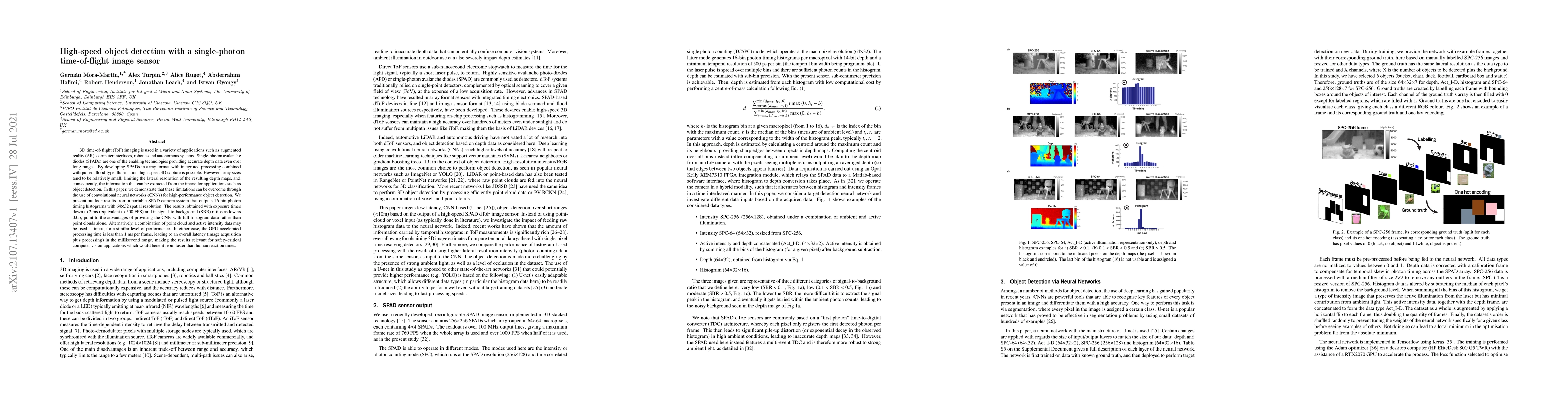 This paper demonstrates high-speed object detection using a single-photon time-of-flight image sensor with convolutional neural networks (CNNs) to overcome limitations in lateral resolution. The portable SPAD camera system achieves 500 FPS with sub-millisecond processing time, showing the effectiveness of full histogram data for detection in low signal-to-background ratios.