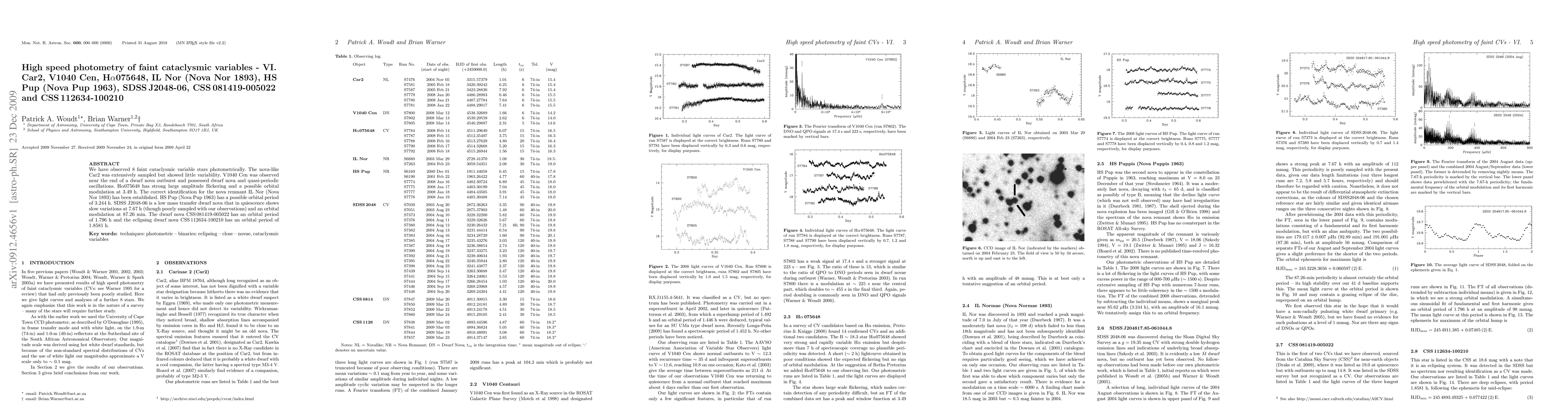 We have observed 8 faint cataclysmic variable stars photometrically. The nova-like Car2 was extensively sampled but showed little variability. V1040 Cen was observed near the end of a dwarf nova outburst and possessed dwarf nova and quasi-periodic oscillations. Ha 075648 has strong large amplitude flickering and a possible orbital modulation at 3.49 h. The correct identification for the nova remnant IL Nor (Nova Nor 1893) has been established. HS Pup (Nova Pup 1963) has a possible orbital period of 3.244 h. SDSS J2048-06 is a low mass transfer dwarf nova that in quiescence shows slow variations at 7.67 h (though poorly sampled with our observations) and an orbital modulation at 87.26 min. The dwarf nova CSS 081419-005022 has an orbital period of 1.796 h and the eclipsing dwarf nova CSS 112634-100210 has an orbital period of 1.8581 h.