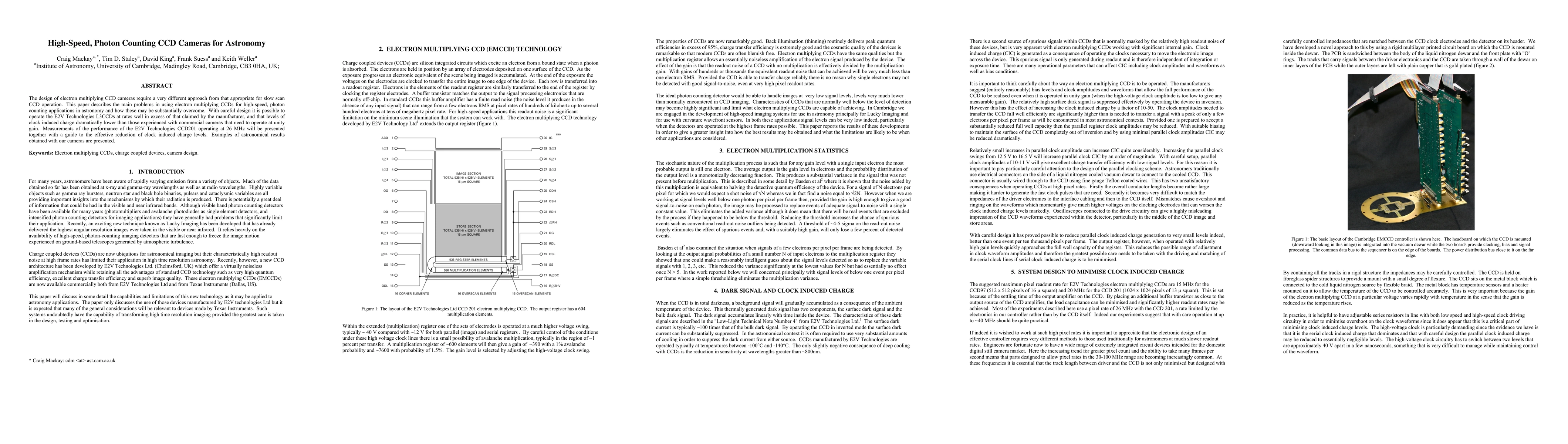 This paper discusses the design and optimization of high-speed, photon counting electron multiplying CCD cameras for astronomical applications, demonstrating significant improvements over commercial models in terms of speed and reduced clock induced charge. Performance measurements of the E2V Technologies CCD201 at 26 MHz are presented, along with strategies for minimizing clock-induced noise.