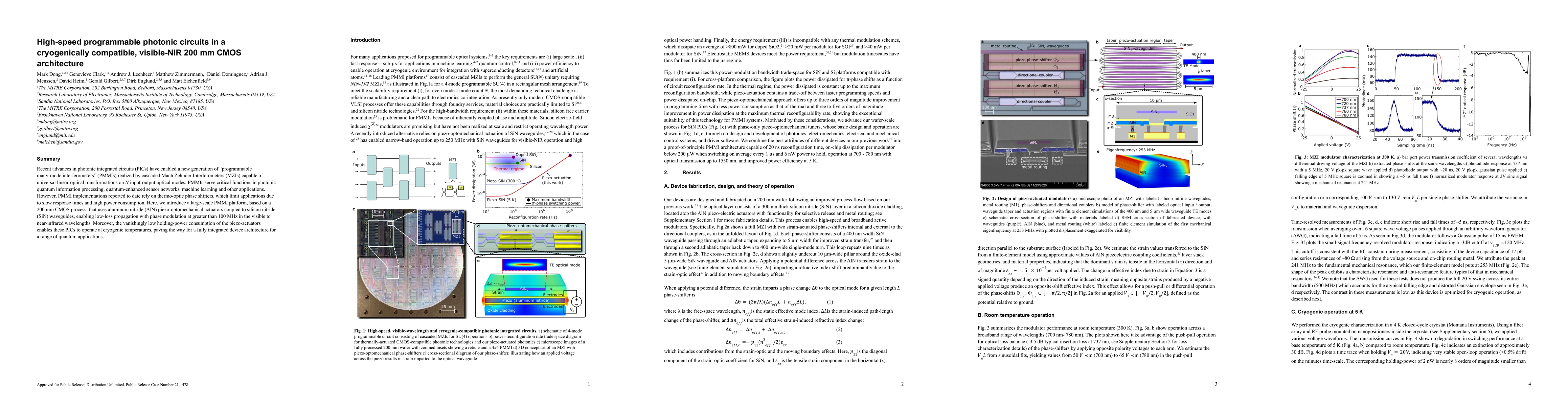 This paper introduces a large-scale programmable many-mode interferometer (PMMI) platform in a 200 mm CMOS architecture using AlN piezo-optomechanical actuators for fast, low-power phase modulation in visible to near-infrared wavelengths. The cryogenic compatibility of the design opens new possibilities for quantum applications.
