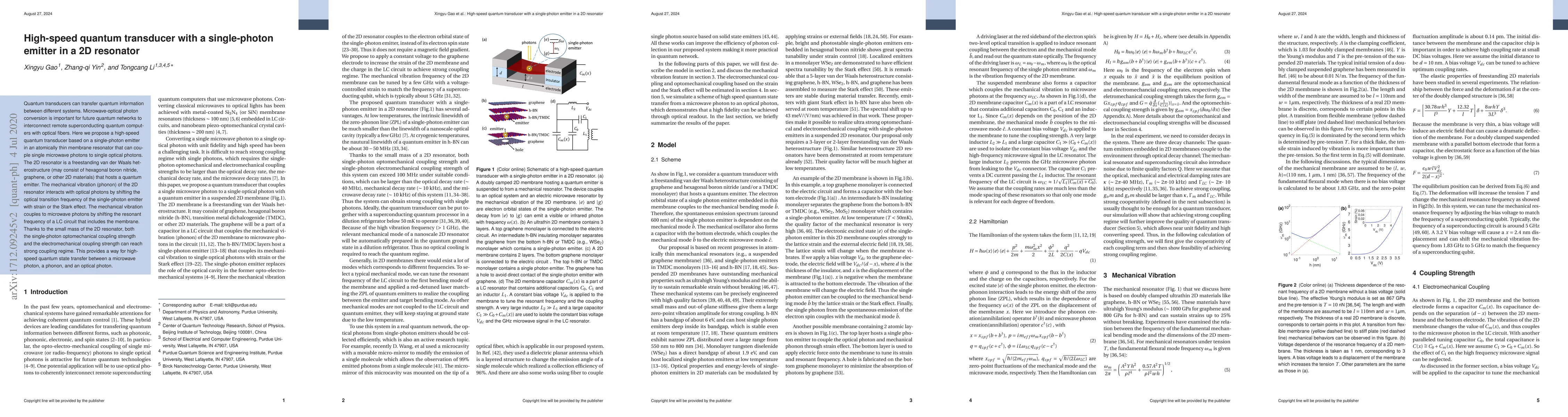 This paper proposes a high-speed quantum transducer utilizing a single-photon emitter in a 2D resonator to convert microwave photons to optical photons, enabling efficient quantum state transfer. The 2D resonator's mechanical vibration strongly couples to both microwave and optical photons, facilitating rapid quantum information transfer in future quantum networks.