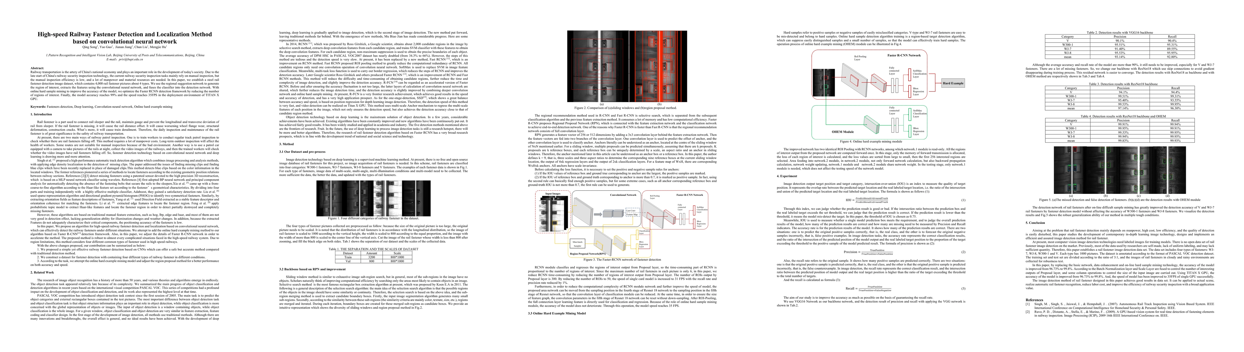 This paper proposes a high-speed railway fastener detection and localization method using a convolutional neural network (CNN) and Faster RCNN framework. The model achieves 99% accuracy and 35 FPS on a TITAN X GPU, significantly improving the efficiency of railway fastener inspection compared to manual methods.