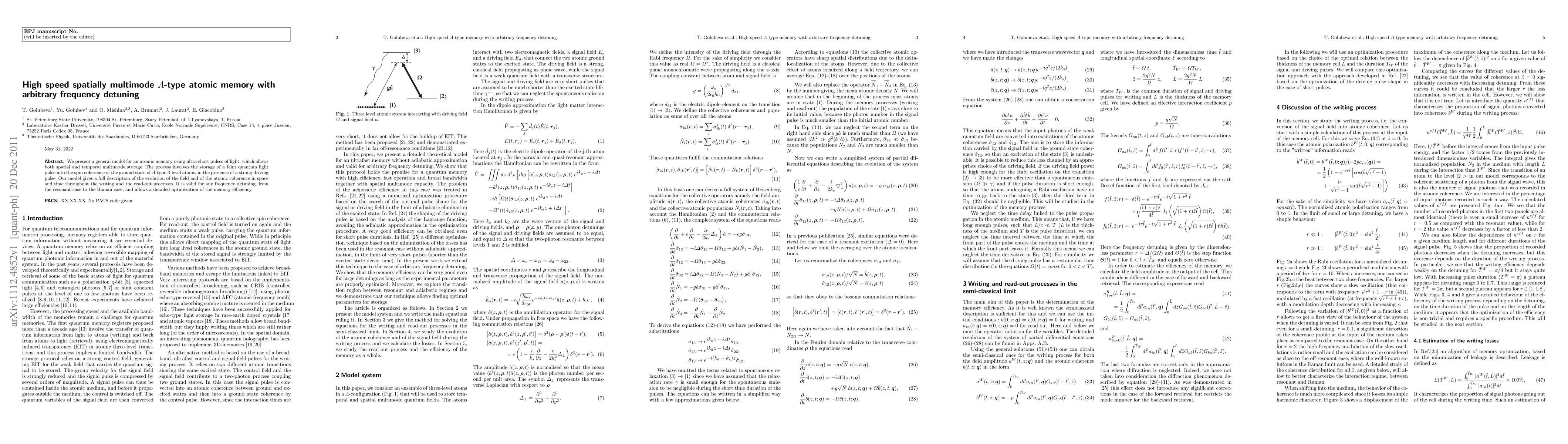 This paper proposes a model for high-speed, spatially multimode atomic memory using Lambda-type 3-level atoms, enabling both spatial and temporal storage of quantum light pulses. The model optimizes memory efficiency across various frequency detunings, from resonant to Raman cases.
