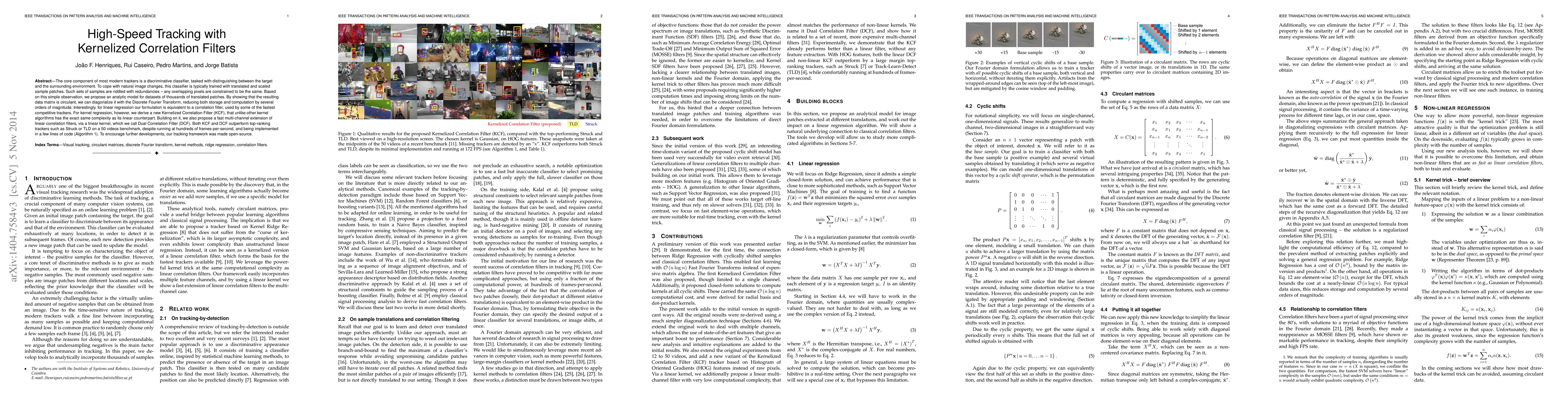 This paper proposes Kernelized Correlation Filters (KCF) and Dual Correlation Filter (DCF) for high-speed object tracking, leveraging kernel regression to maintain computational efficiency. The method reduces storage and computation by transforming the data matrix into the frequency domain, outperforming existing trackers while maintaining high frame rates.