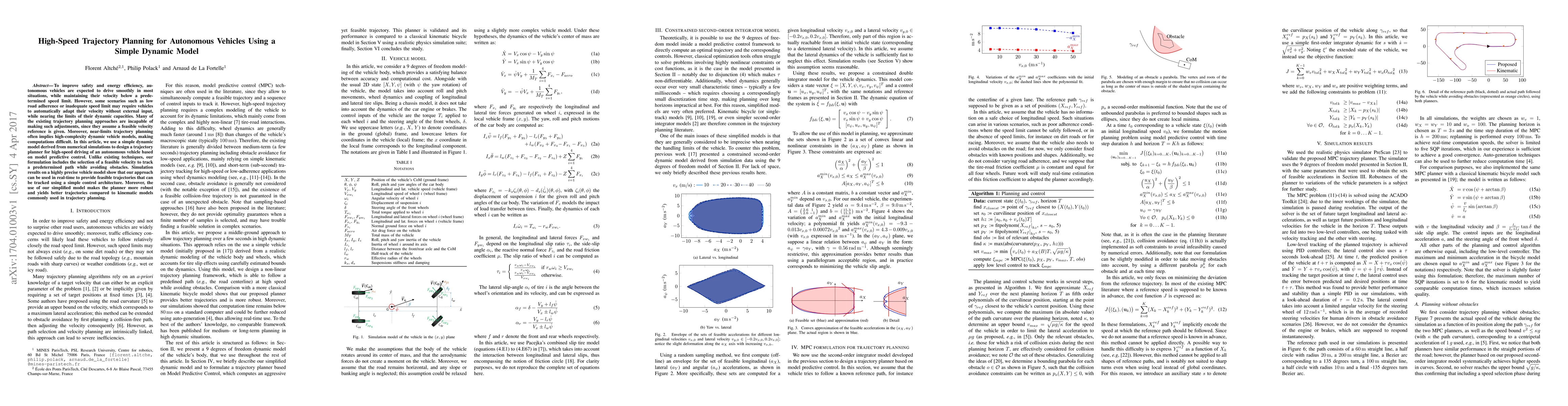 To improve safety and energy efficiency, autonomous vehicles are expected to drive smoothly in most situations, while maintaining their velocity below a predetermined speed limit. However, some scenarios such as low road adherence or inadequate speed limit may require vehicles to automatically adapt their velocity without external input, while nearing the limits of their dynamic capacities. Many of the existing trajectory planning approaches are incapable of making such adjustments, since they assume a feasible velocity reference is given. Moreover, near-limits trajectory planning often implies high-complexity dynamic vehicle models, making computations difficult. In this article, we use a simple dynamic model derived from numerical simulations to design a trajectory planner for high-speed driving of an autonomous vehicle based on model predictive control. Unlike existing techniques, our formulation includes the selection of a feasible velocity to track a predetermined path while avoiding obstacles. Simulation results on a highly precise vehicle model show that our approach can be used in real-time to provide feasible trajectories that can be tracked using a simple control architecture. Moreover, the use of our simplified model makes the planner more robust and yields better trajectories compared to kinematic models commonly used in trajectory planning.