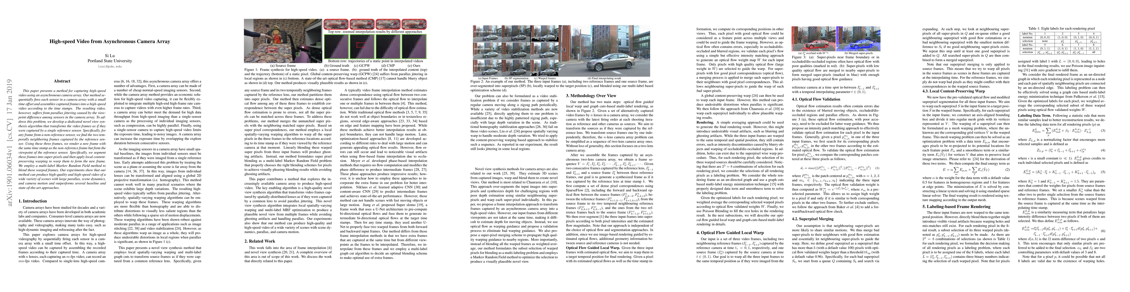 This paper proposes a high-speed video capture method using an asynchronous camera array, addressing parallax jittering with a novel view synthesis algorithm that blends frames from different sensors to simulate a single reference sensor's viewpoint, achieving high-quality results across diverse scenes.