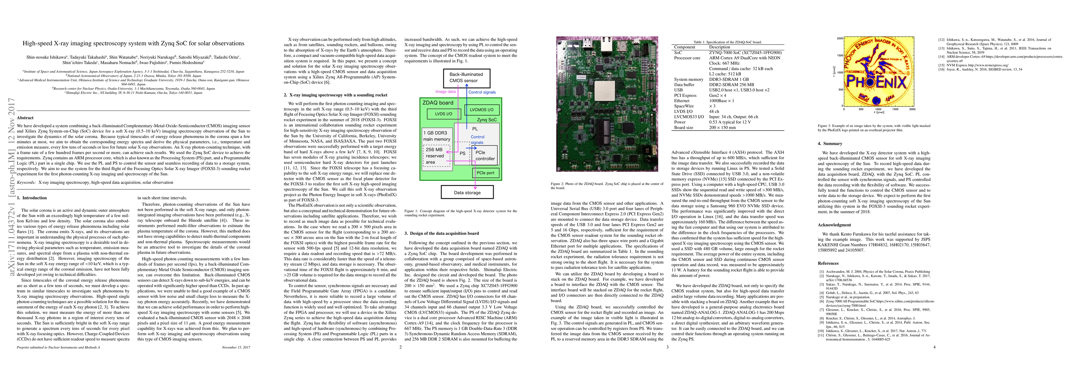This paper describes a high-speed X-ray imaging spectroscopy system integrating a back-illuminated CMOS sensor with a Xilinx Zynq SoC for solar observations, aiming to capture solar corona dynamics with rapid energy spectra and physical parameter derivations. The system employs an X-ray photon-counting technique and the Zynq SoC for efficient data processing and storage.