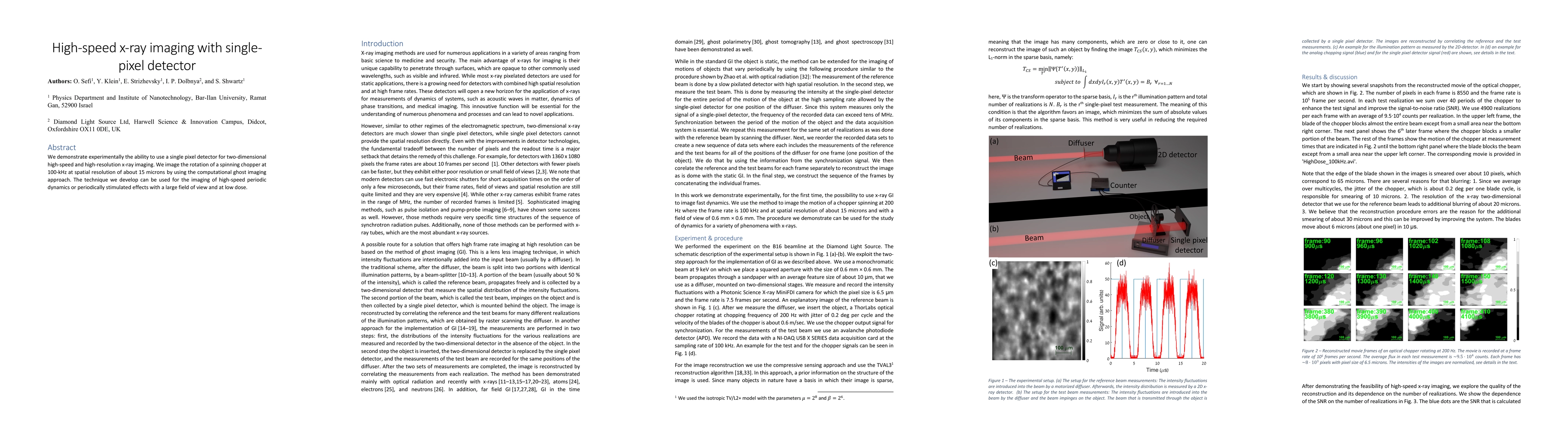 This paper demonstrates the use of a single-pixel detector for high-speed, high-resolution x-ray imaging, achieving 100-kHz rotation imaging of a spinning chopper at 15-micron resolution via computational ghost imaging, offering a low-dose method for dynamic periodic phenomena.