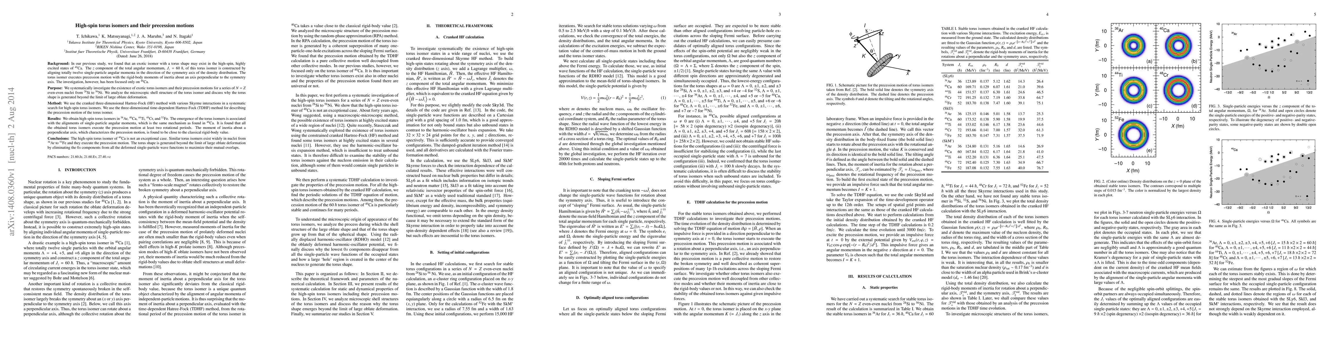 This study systematically explores high-spin torus isomers in even-even nuclei from Ar-36 to Fe-52, using the cranked 3D Hartree-Fock and 3D TDHF methods. Key findings include the existence of torus isomers in Ar-36, Ca-40, Ti-44, Cr-48, and Fe-52, associated with single-particle angular momentum alignments. These isomers exhibit precession motion over at least two rotational periods, with moments of inertia close to classical rigid-body values. The torus shape arises from eliminating 0s components in deformed single-particle wave functions to maximize overlaps.