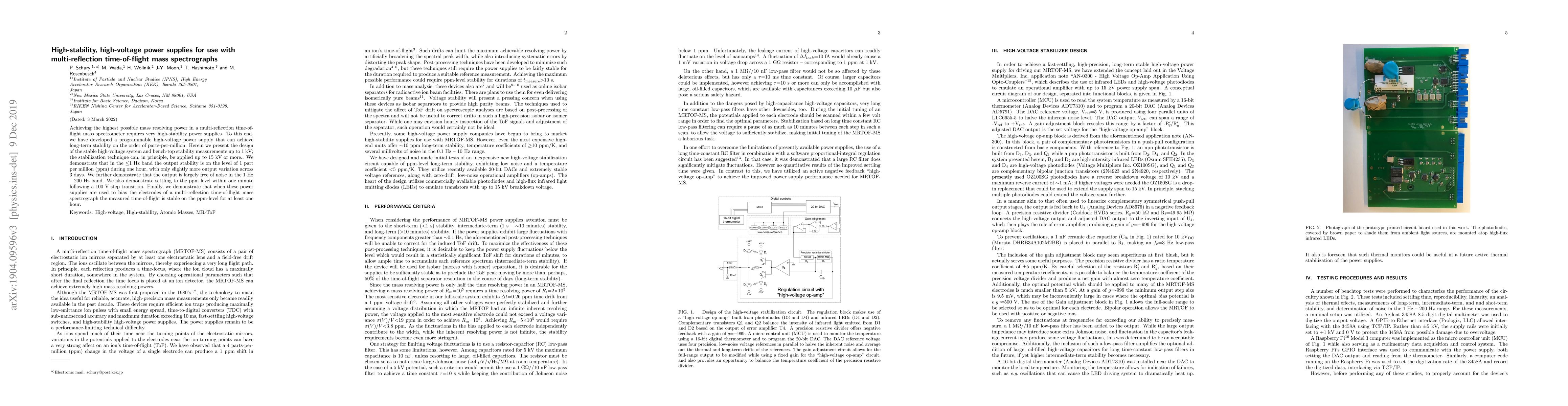 Achieving the highest possible mass resolving power in a multi-reflection time-of-flight mass spectrometer requires very high-stability power supplies. To this end, we have developed a programmable high-voltage power supply that can achieve long-term stability on the order of parts-per-million. Herein we present the design of the stable high-voltage system and bench-top stability measurements up to 1~kV; the stabilization technique can, in principle, be applied up to 15~kV or more.. We demonstrate that in the $\le$1~Hz band the output stability is on the level of 1~part per million (ppm) during one hour, with only slightly more output variation across 3 days. We further demonstrate that the output is largely free of noise in the 1~Hz -- 200~Hz band. We also demonstrate settling to the ppm level within one minute following a 100~V step transition. Finally, we demonstrate that when these power supplies are used to bias the electrodes of a multi-reflection time-of-flight mass spectrograph the measured time-of-flight is stable on the ppm-level for at least one hour.