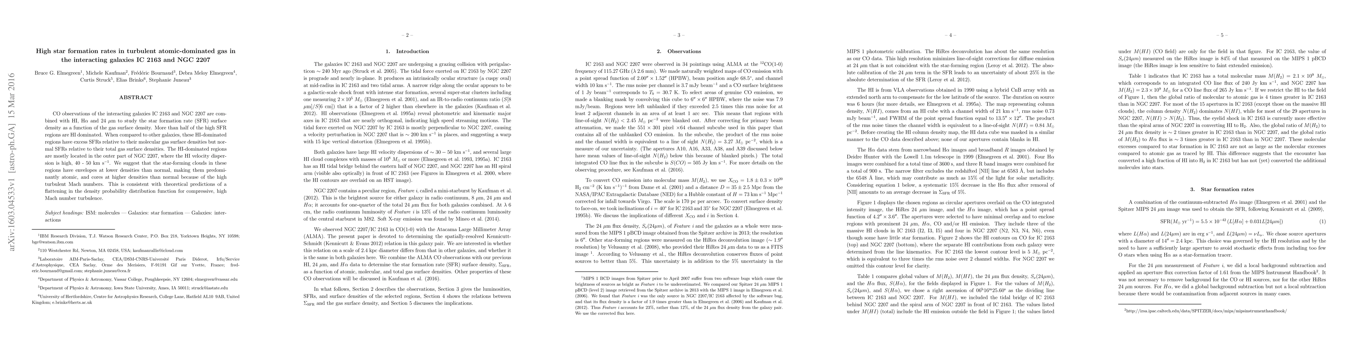 CO observations of the interacting galaxies IC 2163 and NGC 2207 are combined with HI, Halpha and 24 microns to study the star formation rate (SFR) surface density as a function of the gas surface density. More than half of the high SFR regions are HI dominated. When compared to other galaxies, these HI-dominated regions have excess SFRs relative to their molecular gas surface densities but normal SFRs relative to their total gas surface densities. The HI-dominated regions are mostly located in the outer part of NGC 2207, where the HI velocity dispersion is high, 40 - 50 km/s. We suggest that the star-forming clouds in these regions have envelopes at lower densities than normal, making them predominantly atomic, and cores at higher densities than normal because of the high turbulent Mach numbers. This is consistent with theoretical predictions of a flattening in the density probability distribution function for compressive, high Mach number turbulence.
