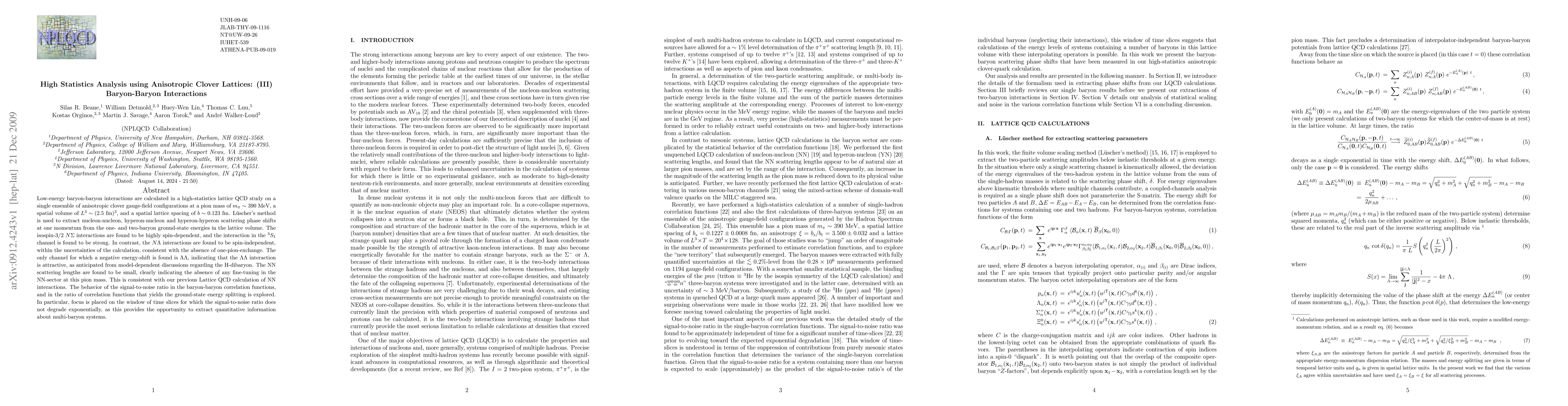 This study uses high-statistics lattice QCD on anisotropic clover lattices to calculate low-energy baryon-baryon interactions at a pion mass of ~390 MeV. It finds strong spin-dependent interactions in NΣ channels and attractive ΛΛ interactions, while NN scattering lengths are small, indicating no fine-tuning in the NN sector at this pion mass.