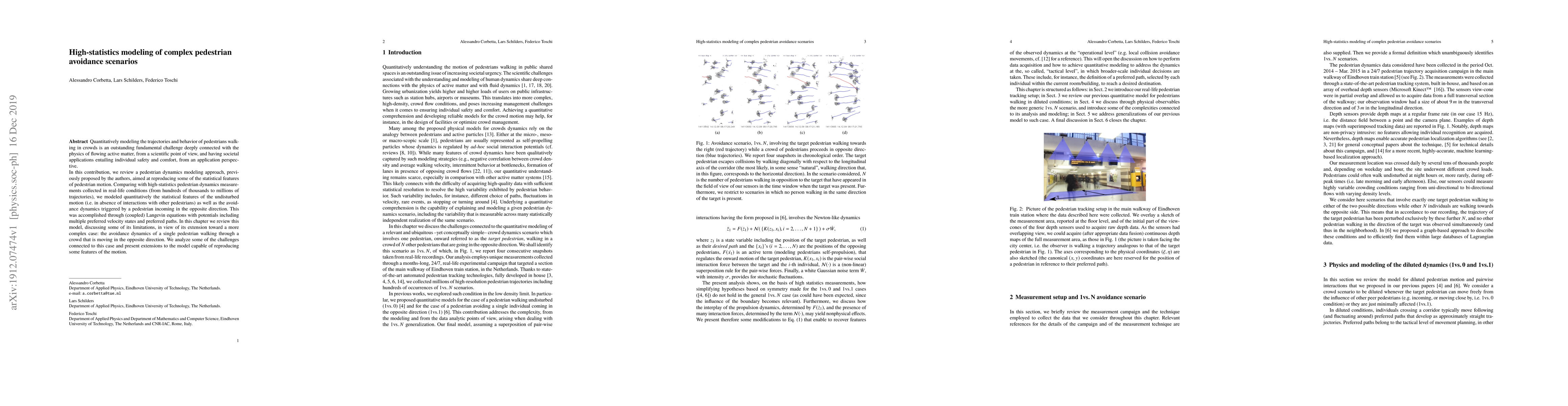 This paper reviews a modeling approach for pedestrian dynamics, focusing on the statistical features of pedestrian motion and avoidance behaviors. The authors use coupled Langevin equations to simulate pedestrian trajectories and discuss limitations and extensions to model avoidance dynamics in crowded scenarios.