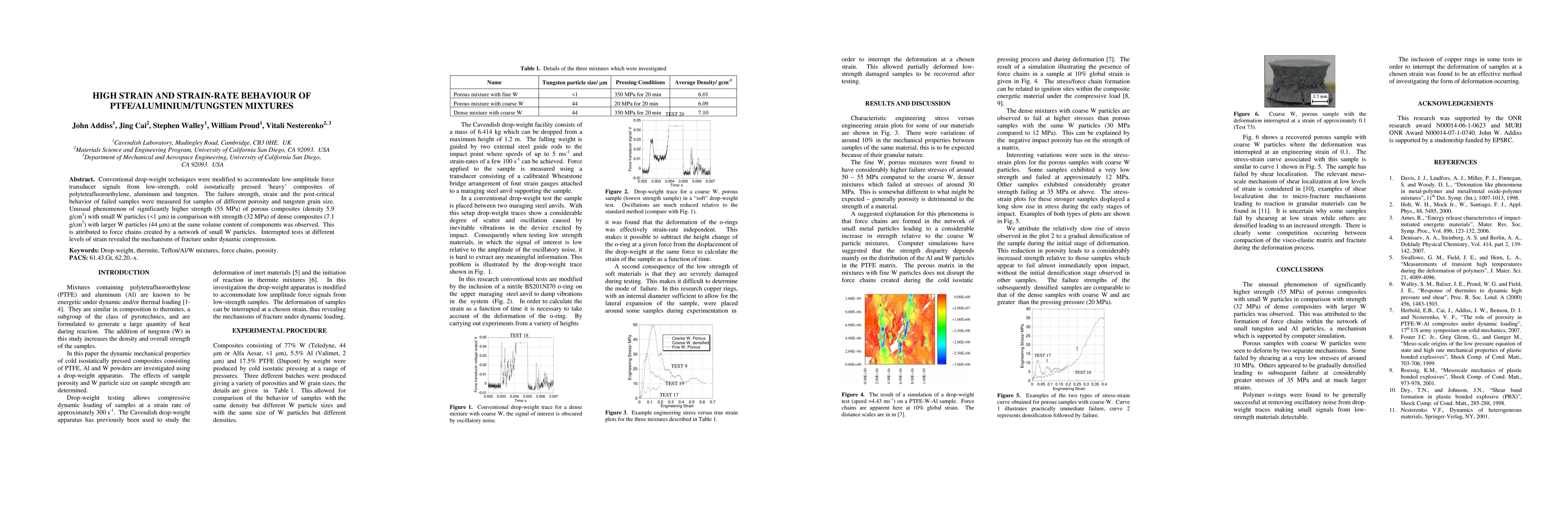This study investigates the high strain and strain-rate behavior of PTFE/Al/W composites using modified drop-weight techniques. It reveals that porous composites with small tungsten particles exhibit significantly higher strength (55 MPa) compared to dense composites with larger tungsten particles, attributed to the force chains formed by small particles.