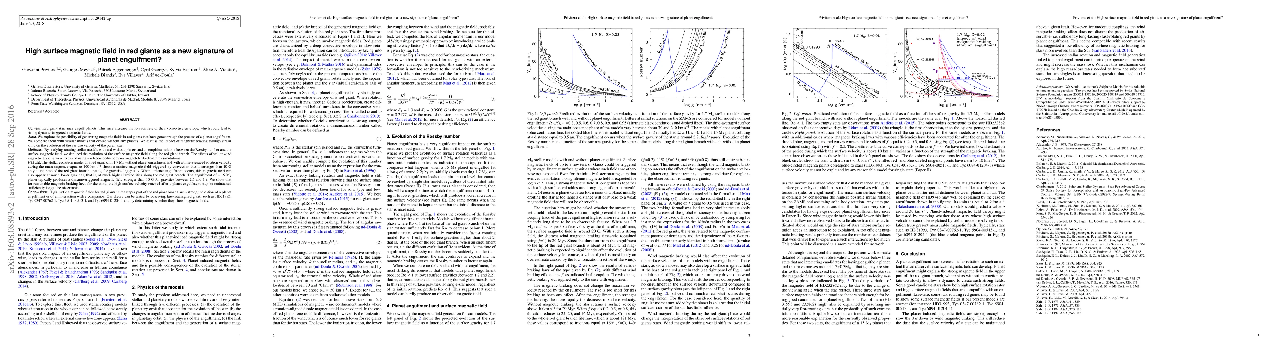 Context. Red-giant stars may engulf planets. This may increase the rotation rate of their convective envelope, which could lead to strong dynamo-triggered magnetic fields. Aims. We explore the possibility of generating magnetic fields in red giants that have gone through the process of a planet engulfment. We compare them with similar models that evolve without any planets. We discuss the impact of stellar wind magnetic braking on the evolution of the surface velocity of the parent star. Methods. With rotating stellar models with and without planets and an empirical relation between the Rossby number and the surface magnetic field, we deduce the evolution of the surface magnetic field along the red-giant branch. The effects of wind magnetic braking is explored using a relation deduced from MHD simulations. Results. The stellar evolution model of a 1.7 M$_\odot$ without planet engulfment and that has a time-averaged rotation velocity during the Main-Sequence equal to 100 km s$^{-1}$, shows a surface magnetic field triggered by convection larger than 10 G only at the base of the red giant branch, that means for gravities log $g > 3$. When a planet engulfment occurs, such magnetic field can also appear at much lower gravities, i.e. at much higher luminosities along the red giant branch. Typically the engulfment of a 15 M$_J$ planet produces a dynamo triggered magnetic field larger than 10 G for gravities between 2.5 and 1.9. We show that for reasonable wind magnetic braking laws, the high surface velocity reached after a planet engulfment may be maintained sufficiently long for being observable. Conclusions. High surface magnetic fields for red giants in the upper part of the red giant branch is a strong indication of a planet engulfment or of an interaction with a companion. Our theory can be tested by observing fast rotating red giants and check whether they show magnetic fields.