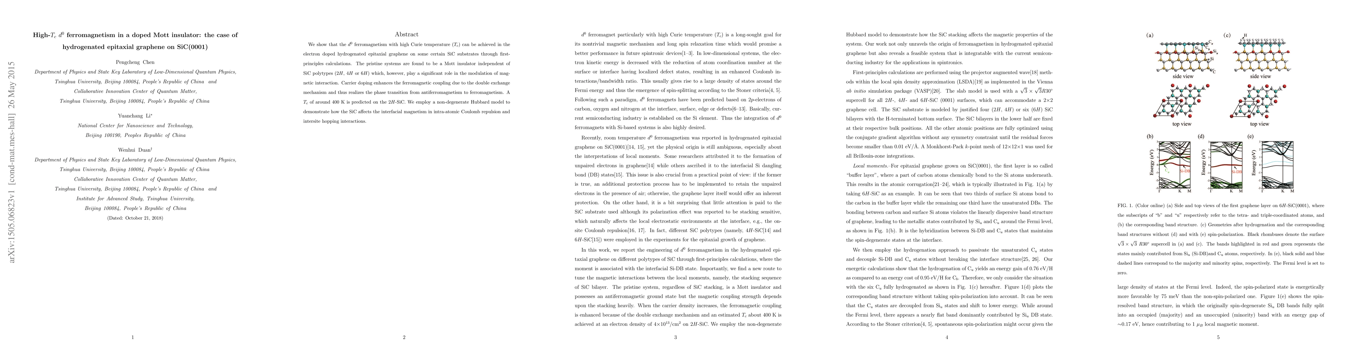 We show that the $d^{0}$ ferromagnetism with high Curie temperature ($T_c$) can be achieved in the electron doped hydrogenated epitaxial graphene on some certain SiC substrates through first-principles calculations. The pristine systems are found to be a Mott insulator independent of SiC polytypes (2$H$, 4$H$ or 6$H$) which, however, play a significant role in the modulation of magnetic interaction. Carrier doping enhances the ferromagnetic coupling due to the double exchange mechanism and thus realizes the phase transition from antiferromagnetism to ferromagnetism. A $T_c$ of around 400 K is predicted on the 2$H$-SiC. We employ a non-degenerate Hubbard model to demonstrate how the SiC affects the interfacial magnetism in intra-atomic Coulomb repulsion and intersite hopping interactions.