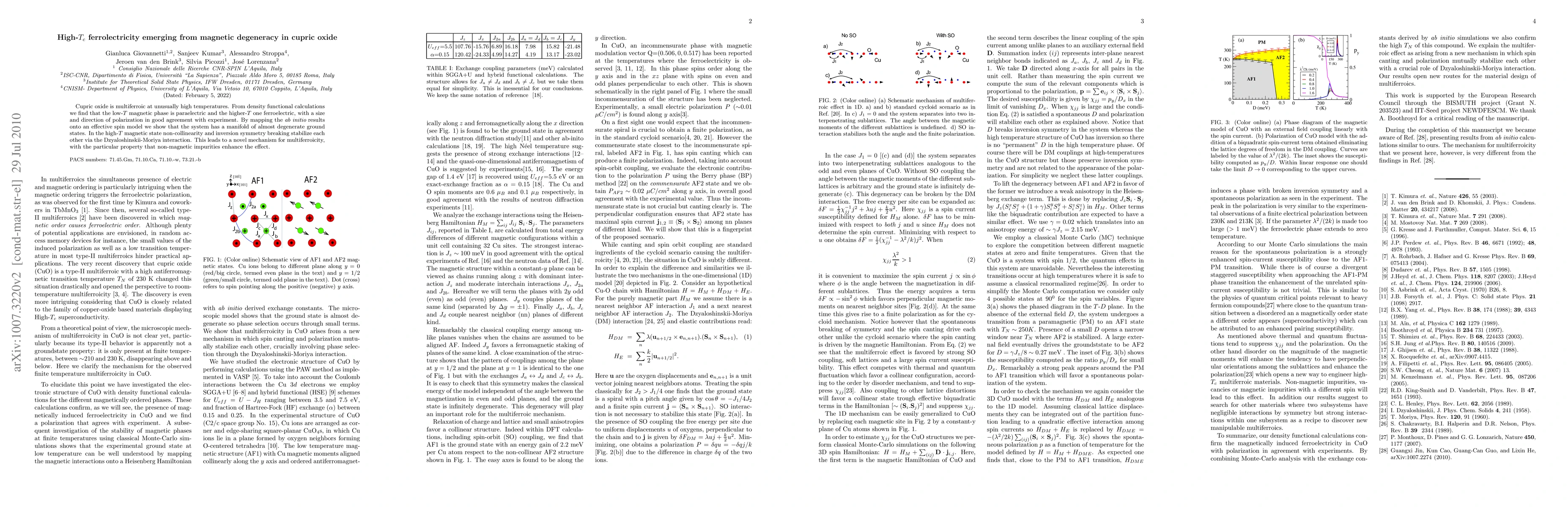 Cupric oxide exhibits high-temperature ferroelectricity emerging from magnetic degeneracy, with non-collinearity and inversion symmetry breaking stabilized by the Dzyaloshinskii Moriya interaction, enhancing the ferroelectric effect even with non-magnetic impurities.